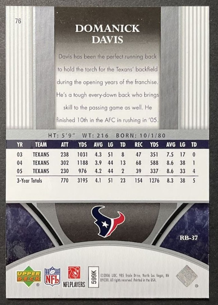 About Me Other Listings Feedback Add to Favorites Contact Me eBay Store Calgary Card Shop 2006 Upper Deck Ultimate Collection Domanick Davis 397/525 Houston Texans #76 No stock photo / These are real scans or pictures Details Description: Domanick Davis Category: Football Year: 2006 Product: Upper Deck Ultimate Collection Team: Houston Texans Card Number: 76 Serial Number: 397/525 Dimensions: 3½" x 2½" SKU: FT B00001 R01 H (11) Shipping Shipping Canada: Lettermail or Registered Mail, Expedited Parcel Combined Shipping Free United States: USPS First Class Combined Shipping $0.50/each USPS First Class Listing By Kronocard trading cards software v2.8.2.3