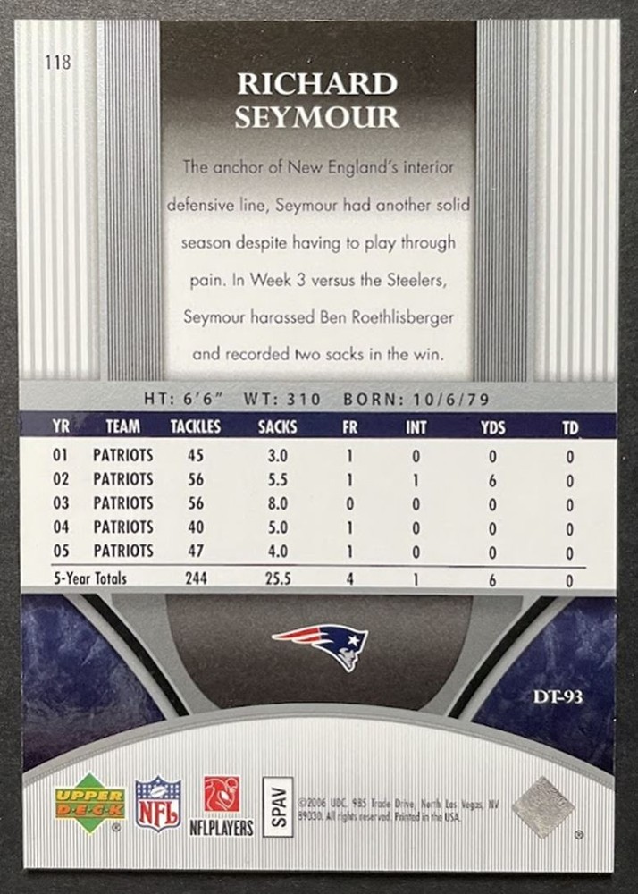 About Me Other Listings Feedback Add to Favorites Contact Me eBay Store Calgary Card Shop 2006 Upper Deck Ultimate Collection Richard Seymour 020/525 New England Patriots No stock photo / These are real scans or pictures Details Description: Richard Seymour Category: Football Year: 2006 Product: Upper Deck Ultimate Collection Team: New England Patriots Card Number: 118 Serial Number: 020/525 Dimensions: 3½" x 2½" SKU: FT B00001 R01 H (8) Shipping Shipping Canada: Lettermail or Registered Mail, Expedited Parcel Combined Shipping Free United States: USPS First Class Combined Shipping $0.50/each USPS First Class Listing By Kronocard trading cards software v2.8.2.3