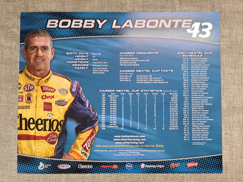2007 BOBBY LABONTE autographed NASCAR 8×10 Photo Card Cheerios Dodge. I'm the original owner of this piece and witnessed Bobby sign this card in front of me. I worked for General Mills at the time Bobby Labonte was at the headquarters in Minneapolis for a promotional appearance. See pictures for the overall condition of the item. Let me know of any questions or if you need additional pictures. Thanks for your interest.