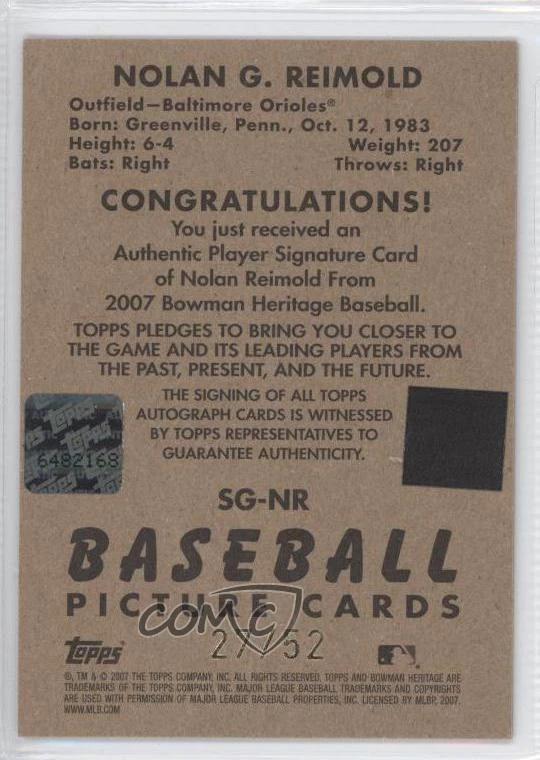 2007 Bowman Heritage - Signs of Greatness - Black #SG-NR Nolan Reimold Qty Made: 52 - Baseball Card - Featuring the Baltimore Orioles - Featuring Nolan Reimold Search for more: 2007 Bowman Heritage Search for more: 2007 Bowman Heritage - Signs of Greatness - Black View all of our Listings Auctions Buy It Now About Us Located in the beautiful Pacific Northwest, COMC (Check Out My Cards) is the world's largest consignment service for trading card singles. More than 10,000 people have used our consignment service to list over 50 million trading cards. We currently house 20 million cards, each listed for sale with front and back images of the actual card. Find out how we can help you consign your items on eBay by contacting us through eBay messaging. COMC -- "The Safe & Easy Way to Buy & Sell" Representative Image - Select Specific Item above to see image of actual item Representative Image - Select Specific Item above to see image of actual item Raw Condition for Modern Cards Unless otherwise noted, raw modern cards are listed in Near Mint-Mint condition or better. A NM-MT card appears to be Mint at first glance, but upon closer inspection, may exhibit some of the following: minor print defects (e.g. roller marks, print line, dimple), minor scratches, slight edge wear, and slight corner wear. Centering is clearly visible in the images provided and does not factor into our condition assessment. Raw Condition for Vintage Cards Unless otherwise noted, raw vintage cards are listed in Excellent condition or better. An EX card may exhibit some of the following: minor rounding of corners, surface wear, print defects, light scratches, and slight edge wear/chipping. Centering is clearly visible in the images provided and does not factor into our condition assessment. Domestic Shipping Combined shipping for multiple items is available. To receive combined shipping, please ensure all desired items are in your eBay shopping cart before proceeding to checkout. eBay limits orders to 40 items per order. We automatically combine multiple orders placed on the same day. If you place multiple orders on the same day, please contact us to request a refund of applicable shipping costs. Signature confirmation may be required on invoices over $400. Raw cards are shipped in toploaders. International Shipping COMC offers eBay's International Shipping (EIS) for international orders under $2,500* (see country exceptions below). All duties and import fees are paid at checkout; in the rare event that there are additional import fees upon delivery, these are borne by the buyer. EIS packages route through a shipping hub in Erlanger, KY before shipping to their final destination. Please note that EIS does not allow for combined shipments. The shipping rates are determined by eBay and cannot be adjusted. *Maximum sale price exceptions: Colombia, Kuwait ($2,000); Taiwan ($1,539); Chile, Costa Rica, Guatemala, Honduras, Trinidad and Tobago ($1,000); Antigua and Barbuda, Aruba, Belize, Dominica, Grenada, Philippines, Saint Kitts and Nevis, Saint Lucia, Montserrat, Turks and Caicos Islands ($500); Dominican Republic, El Salvador ($200). Please request a shipping quote through eBay messaging for orders that exceed the maximum sale price supported by eBay's International Shipping. You will be responsible for all duties and import fees for international orders shipped outside the EIS. Raw cards are shipped in toploaders. Payment COMC does not accept offers on our cards through our eBay storefront. COMC utilizes eBay’s managed payments system. If you are experiencing difficulties making a payment, please contact eBay for assistance. Return Policy Returns are only accepted on the rare occasion the item is not as described. If you are making a return, please initiate the return process through eBay so a mailing label can be provided for you. Prior to listing, our expert team carefully assessed this item to represent it accurately. Please review the description and high-definition images prior to purchasing to ensure this item meets your satisfaction. We welcome you to contact us if you have further questions about this item. Trust and Integrity COMC carefully assesses each item consigned to us to prevent fraudulent items from entering the marketplace. If you believe an item offered on COMC may be fraudulent, please contact us with details so we can investigate the issue. Items we determine are outside our supported items policy may be removed. Last Modified: 1/8/2025 9:25:16 AM PDT