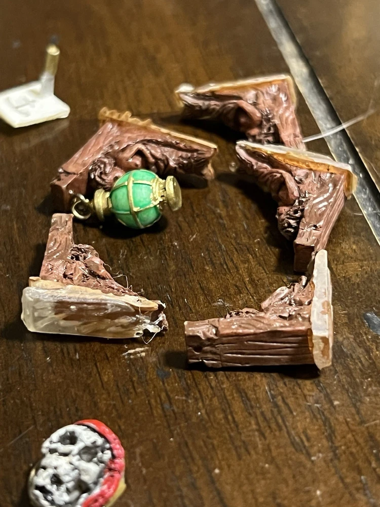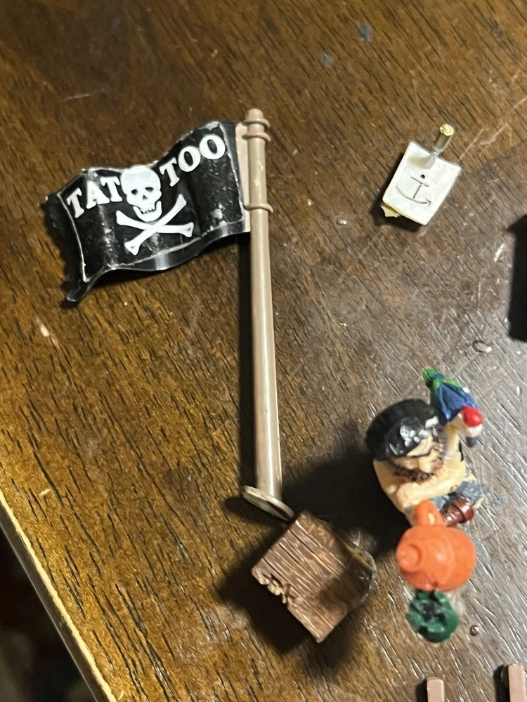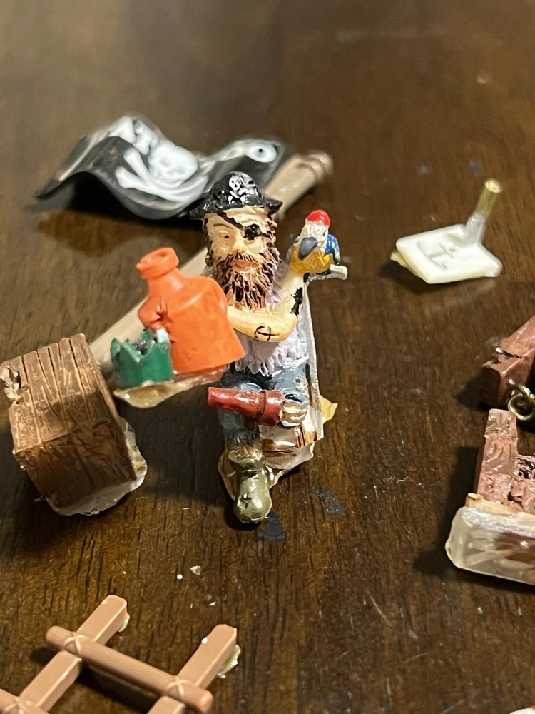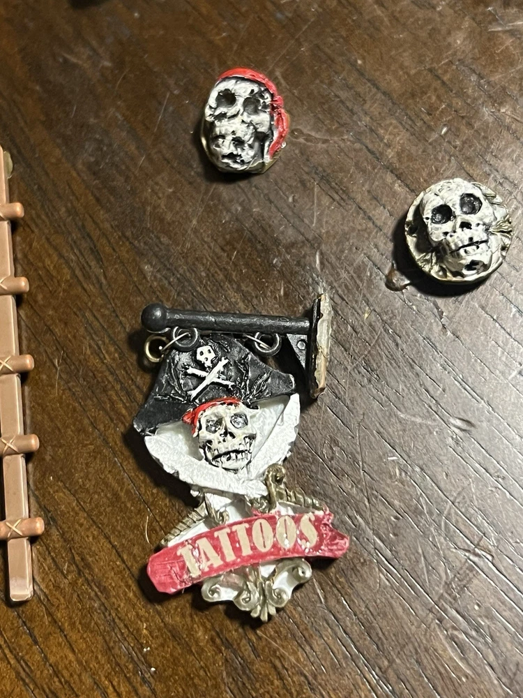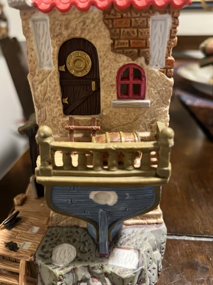 This spooky pirate-themed house is a fantastic addition to any Halloween village! The detailed ceramic design with tattoos and piercings gives it a unique, eerie vibe. Even though some pieces may need reattaching, it’s still a great collector’s item with tons of character. Perfect for adding a creepy touch to your seasonal decor!
