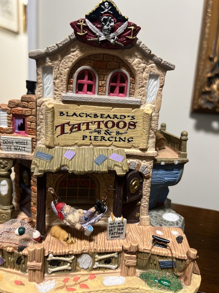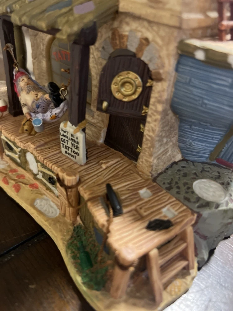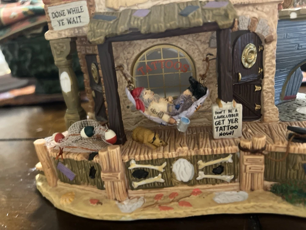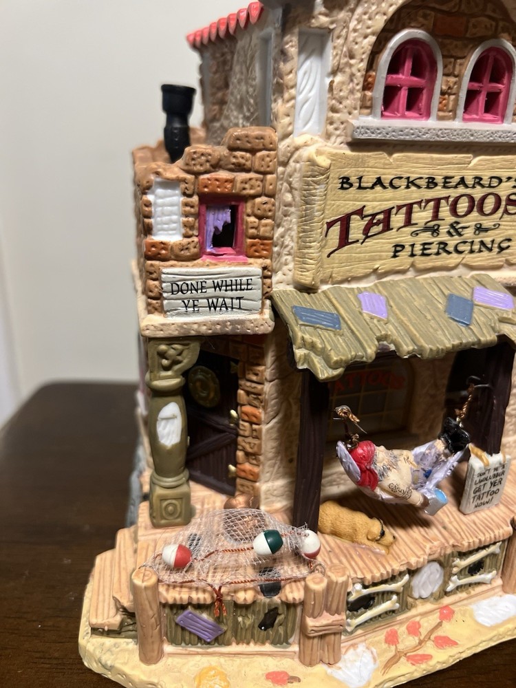 The Limited 2007 LEMAX Halloween Village SPOOKY TOWN Blackbeard's Tattoos Piercing is a ceramic and porcelain house from the Spooky Town collection by Lemax. This asymmetrical house is perfect for Halloween decorations, with a spooky theme that includes pirates and tattoos. Manufactured in 2007, this unique piece is suitable for any room and is a must-have for collectors of holiday and seasonal villages and houses. *** Some pieces have fallen off - can hot glue them back on, but can package with them separate so they don't fall off again***