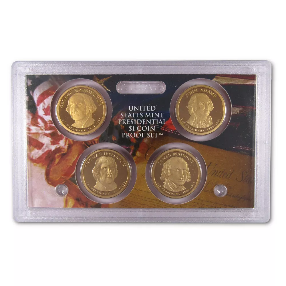 Home About Us Feedback View All Listings Contact Us Menu Home About Us Feedback View All Listings Contact Us 2007 Presidential Dollar Proof Set U.S. Mint Packaging OGP COA This official 2007 U.S. Mint 4 coin Presidential Dollar Proof Set contains the highest quality 2007 Presidential dollars, all in an official U.S. Mint holder. Honoring former presidents George Washington, John Adams, Thomas Jefferson, and James Madison, these proof coins feature sharp frosted images against brilliant mirror-like surfaces. Comes with the original U.S. Mint packaging, including a certificate of authenticity. These sets were made in 2007 and are not brand new. The packaging may show signs of wear such as minor folds and scrapes. The images used for this listing are stock photos from our inventory. Your purchase is guaranteed to match the quality of the product shown. Profile Coins & Collectibles - More Coins for the Money! Coin Type U.S. Mint Presidential Dollar Proof Set Denomination $1 Date 2007 Mint Mark S Grade Proof Shop by category Coins: US Half Dollars Quarters Small Cents Dollars Dimes Nickels Three Cents Large Cents Two Cents Paper Money: US Store Newsletter Add our store to your Favorites to receive our email newsletters about new items & special promotions. Sign Up Home About Us Feedback View All Listings Contact Us Copyright © 2019 Profile Coins & Collectibles. All rights reserved. eBay template Design by OCDesignsOnline
