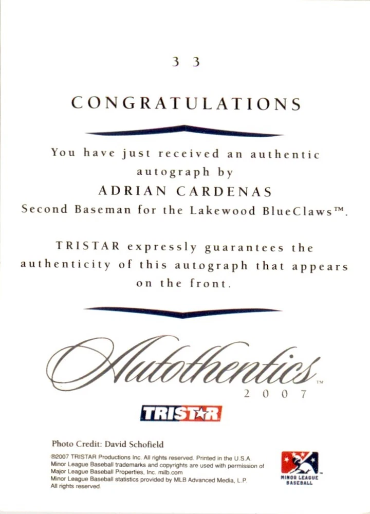 2007 TRISTAR Autothentics Autograph #33 Adrian Cardenas Lakewood Blueclaws Condition: NM-MT