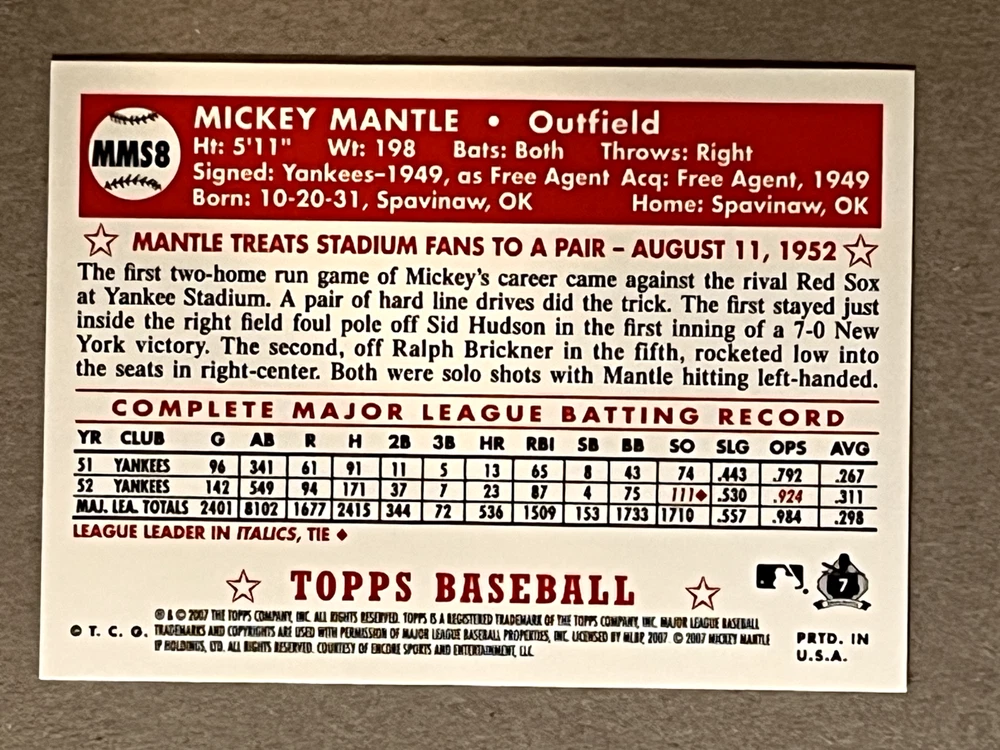 The product is a 2007 Topps baseball trading card featuring Mickey Mantle, a legendary player for the New York Yankees in Major League Baseball. This specific card is part of an insert story card set, with the card number MMS8. It is a collectible item that showcases Mantle's career and achievements, making it a sought-after piece for sports memorabilia enthusiasts and fans of the New York Yankees.