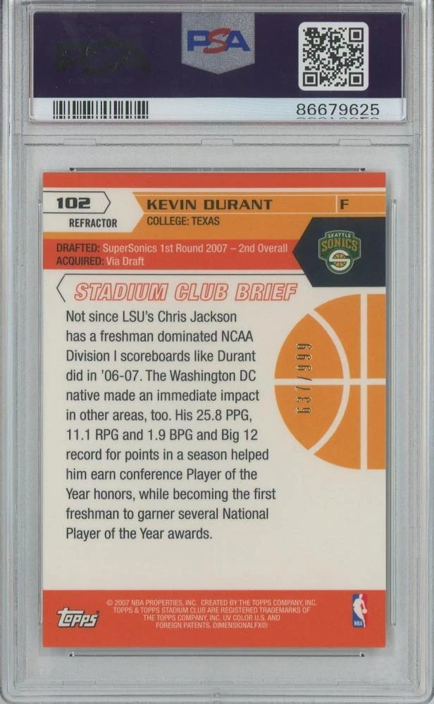 Parallel/Variety:Chrome RefractorSeason:2007-08League:National Basketball Association (NBA)Series:Topps Stadium ClubManufacturer:ToppsPrint Run:999Card Number:102brand:ToppsFeatures:Rookie, Serial Numbered, Base Set, Parallel/VarietySubset:NBA RookieAdditional Description:NBA Rookie - Kevin DurantSet:2007-08 Topps Stadium ClubTeam:Seattle SupersonicsSport:BasketballPlayer/Athlete:Kevin Durant