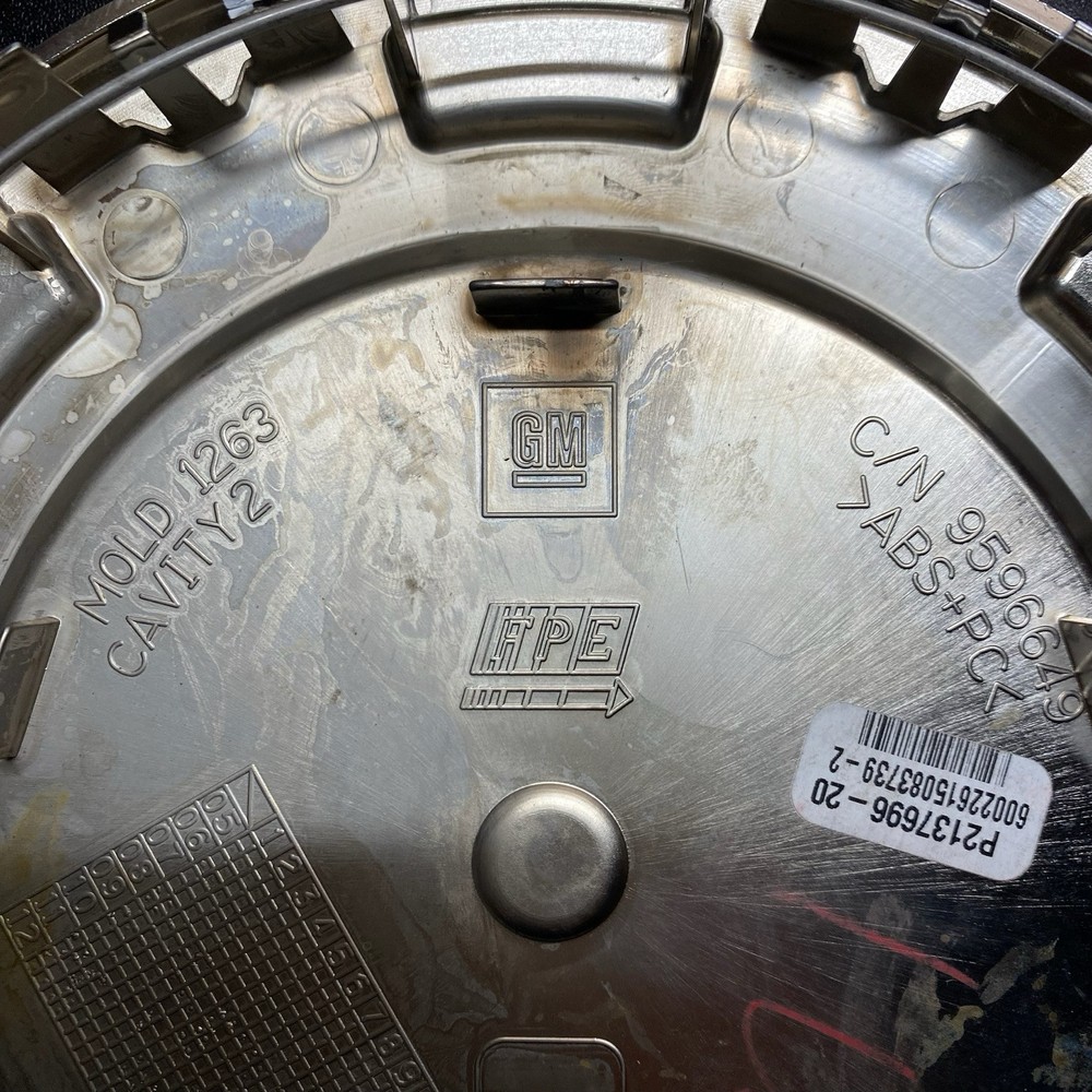 This is a used wheel center cap designed for a 2007-2009 Cadillac Escalade. The center cap is silver in color and made of chrome material, featuring an emblem with the Cadillac logo. It has a manufacturer part number of 9596649 and an inside diameter of 8 inches. The cap is designed for the front left placement on the vehicle and is easy to install. This original equipment manufacturer (OEM) part is a genuine Cadillac product that provides a specific fitment for the specified vehicle model years.