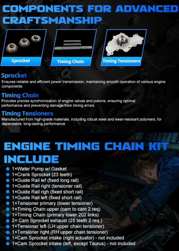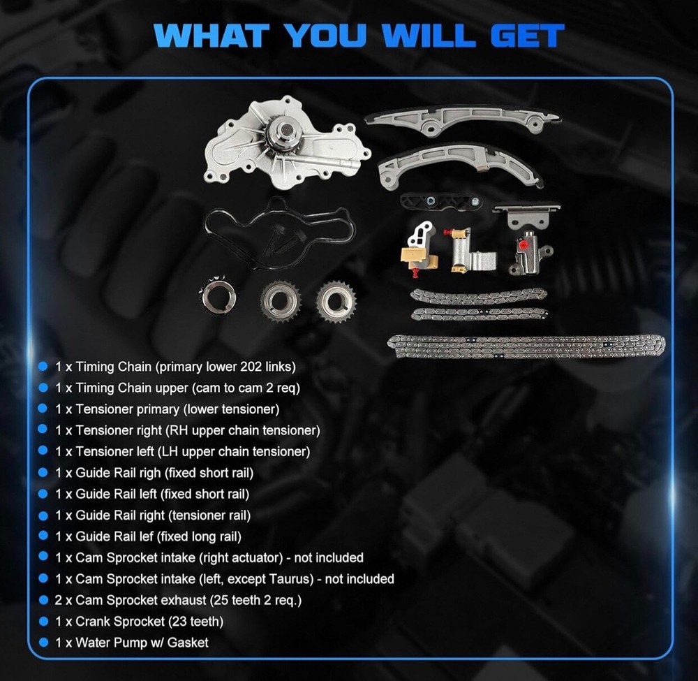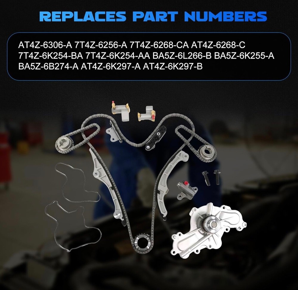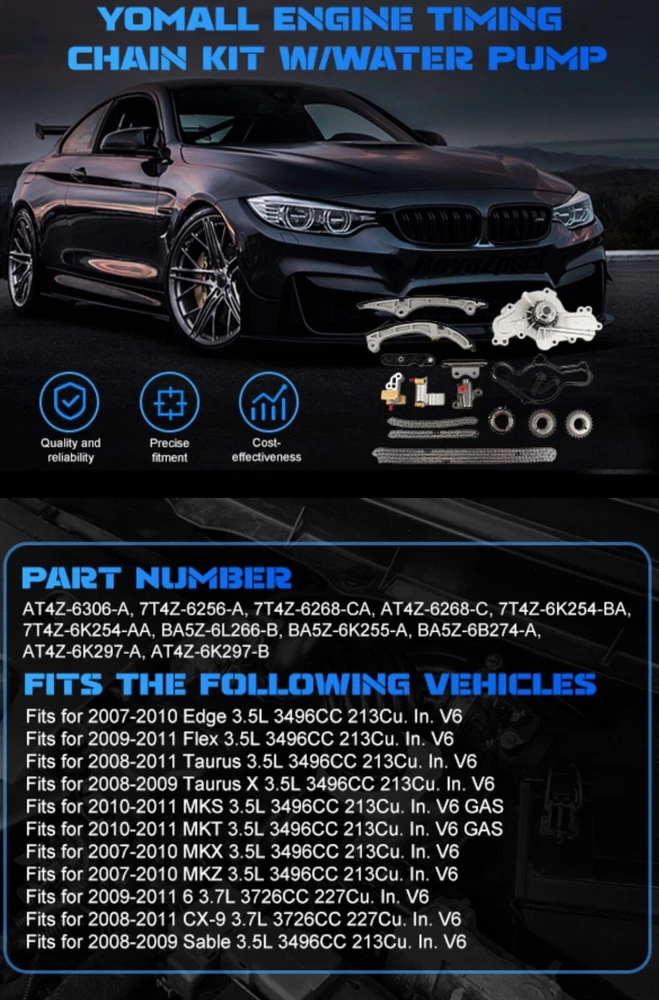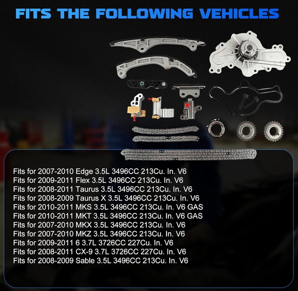 #1144 Engine Timing Chain Kit Timing Chain Kit Fits for 2007-2011 Flex Taurus MKS MKT 6 CX-9 Edge Fusion MKX MKZ Taurus X Sable 3.5L 3.7L Replace# AT4Z-6306-A 7T4Z-6256-A 7T4Z-6268-CA 🚘 PART NUMBER: AT4Z-6306-A Engine Timing Chain Kit with Water Pump fits for AT4Z-6306-A, 7T4Z-6256-A, 7T4Z-6268-CA, AT4Z-6268-C, 7T4Z-6K254-BA, 7T4Z-6K254-AA, BA5Z-6L266-B, BA5Z-6K255-A, BA5Z-6B274-A, AT4Z-6K297-A, AT4Z-6K297-B.The performance results of the accessories will be up to the standard of the original packaging. 🚘 COMPATIBLE WITH:AT4Z-6306-A Engine Timing Chain Kit with Water Pump compatible with 2009-2011 6 3.7L 丨 with 2010 Fusion 3.5L 丨 with 2009-2011 MKS 3.5L 3.7L 丨 with 2010-2011 MKT 3.5L 3.7L 丨 with 2007-2010 MKX 3.5L 丨 with 2007-2010 MKZ 3.5L 丨 with 2009-2011 Flex 3.5L 丨 with 2008-2011 CX-9 3.7L 丨 with 2007-2010 Edge 3.5L 丨 with 2008-2009 Sable 3.5L 丨 with 2008-2011 Taurus 3.5L.For specific year models, please see the detailed description of the applicable model 🚘 PACKAGE INCLUDING: 1 Timing Chain (primary lower 202 links) 丨 1 Timing Chain upper (cam to cam 2 req) 丨 1 Tensioner primary (lower tensioner) 丨 1 Tensioner right (RH upper chain tensioner) 丨 1 Tensioner left (LH upper chain tensioner) 丨 4 Guide Rail ( righ*2 & left *2 )丨 1 Cam Sprocket intake (right actuator) - not included 丨 1 Cam Sprocket intake (left, except Taurus) - not included 丨 2 Cam Sprocket exhaust (25 teeth 2 req.) 丨 1 Crank Sprocket (23 teeth) 丨 1 GMB Water Pump w/ Gasket 🚘 WARM TIPS: Before purchasing, please check your car model and check the following fitment details information.