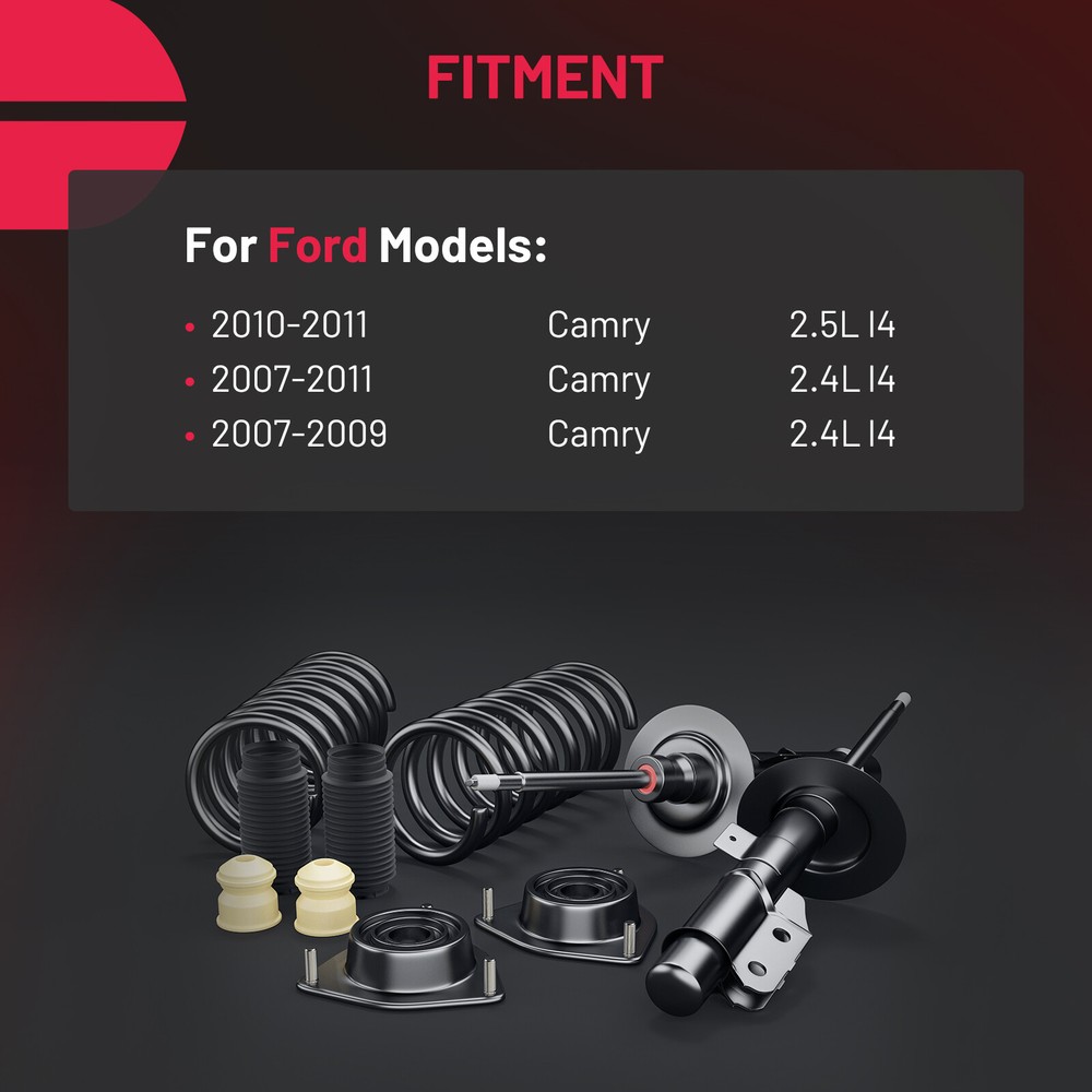 About this item Compatible with: for Toyota Camry 2.4L 2007-2011, 2.5L 2010-2011 Replace for Part Number: Replace 172307 172308 172309 172310 Kit Includes: 1x front left strut shock assembly with coil spring, 1x front right strut shock assembly with coil spring, 1x rear left strut shock assembly with coil spring, 1x rear right strut shock assembly with coil spring 4X Front & Rear Complete Shock Struts W/ Coil Spring For 2007-2011 Toyota Camry 4pc Front & Rear Coil Spring Ready Struts Kit Fits Driver and Passenger Sides Kit Includes: 1x Front Driver Side Complete Strut & Spring Assembly - 172308 1x Front Passenger Side Complete Strut & Spring Assembly - 172307 1x Rear Driver Side Complete Strut & Spring Assembly - 172310 1x Rear Passenger Side Complete Strut & Spring Assembly - 172309 Each Strut Assembly includes: Strut Coil Spring Boot Bumper Kit Spring Seat Isolator FITS: MAKE MODEL YEAR RANGE SPECIFIC DETAILS LEXUS ES350 2007 - 2009 Built Before 07/2009 TOYOTA AVALON 2006 Built After 01/2006 TOYOTA AVALON 2007 - 2012 All Models TOYOTA CAMRY 2007 - 2011 All Models Payment Delivery details Terms of sales About us Contact us Payment 1.We only accept PayPal. PayPal is the only online payment method we accept. Please make sure you have a valid/confirmed PayPal account prior bidding. 2.All Paypal Payments must be Confirmed. Payment must be made within 48hrs of the auction end time. Non-Paying bidders will be reported. 3.When you get your package,maybe you will pay some charges, it's taxes for local customs,not pay to us, and the fees are depends on the customs, all buyer are same. Delivery details 1.Items will be shipped within 2 business days after payment is received. 2.We ship to your eBay address. Please make sure your eBay address is correct. Buyer takes responsibility if eBay address is wrong. 3.Import duties, taxes and charges are not included in the item price or shipping charges. Please check with your country customs office for these additional charges. 4.We shipping using UPS or USPS from our nearest warehouse to you. Tracking numbers will be emailed upon shipment. Terms of sales 1.Please feel free to email us if you have any question. 2.We appreciate you contact us via eBay message when you are not satisfied rather than open case or leave negative feedback directly. We'll try our best to solve the issue. 3.Refund will be issued once we receive your returned items. Buyer is responsible for all return shipping charges. 4.Please contact us for return process before you return the item. 5.All items for exchange or refund must be returned in "as new" condition. About us We are the responsible seller ,always provide high-quality products and best service .If you have any questions, please contact us, and will try our best to help you. Please contact us by eBay Message, and we will reply you within 24 hours. Thank you very much! Contact us We are the professional auto parts manufacturer , and provide line lock, AN hose end fittings , fuel line , fuel filter , fuel regulator , exhaust cutout , exhaust tips , exhaust muffler and so on .The quality of the product to be secured. If you have any questions or any needs , please contact us , and will try our best to help you.