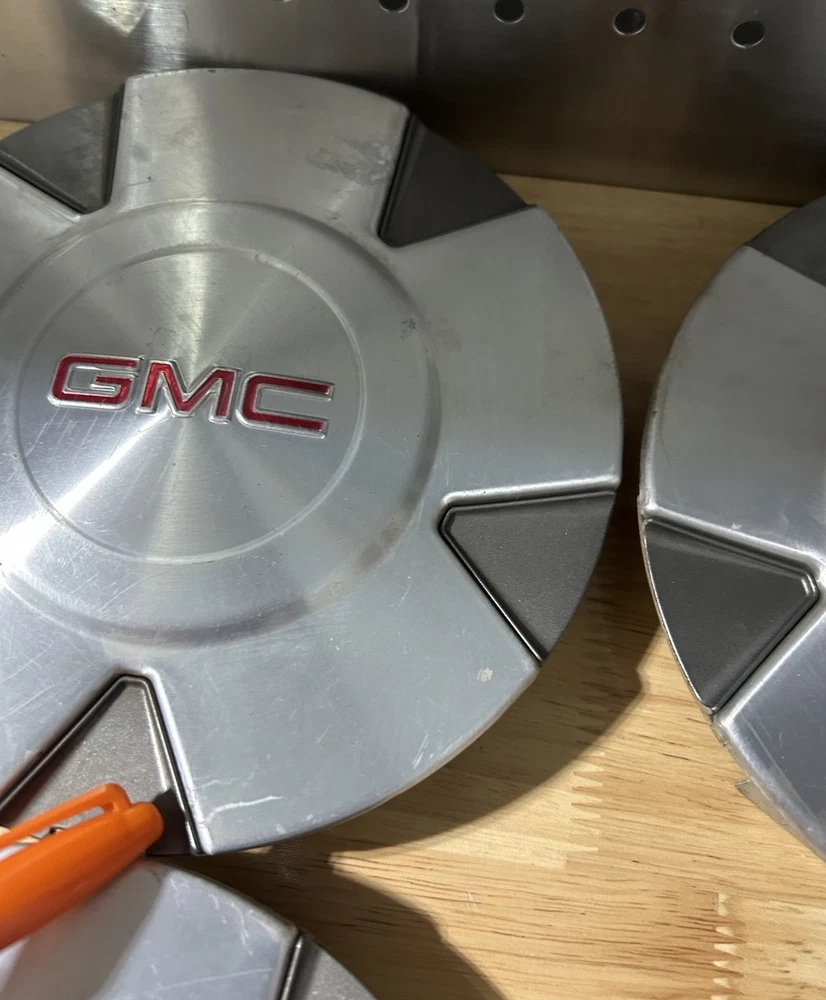 The product is a 4-pack of aftermarket wheel center caps designed for 2007-2012 GMC Acadia vehicles. They are made of plastic with a polished aluminum finish and feature the GMC emblem. The manufacturer part number is 9596977. These center caps are suitable for the rear, left, front, and right placements on the vehicle. The order contains all four center caps. Some do have some scratches and scuffs, which I pointed out in the pictures no cracks and all the tabs are intact. Please verify with the part number prior to making a purchase for a better fit fee of vehicle. If a return is needed, please contact us prior to making a return request. If satisfied with product and service positive feedback is greatly appreciated. Thank you.