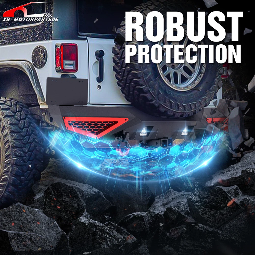 Rear Bumper W/ Detachable License Plate Frame For 2007-2018 Jeep Wrangler JK JKU For safety reasons, we strongly recommend that you seek professional installation services Suitable Models : Compatible with 2007-2018 Jeep Wrangler JK JKU Unlimited 2/4 Doors Package Includes: 1 x Rear Bumper, 2 x D-rings, 2 x LED Lights, 2" Hitch Receiver, 1 x manual, License Plate Frame, Paintable Decor, screw fittings Product Information: Product Dimensions: Please see the size picture Installation mode: Bolt-On With Sensor Holes: No Steel thickness: 3mm Placement on Vehicle: Rear Item Weight: 65 Pounds Material: Carbon Steel Color: Black (hand measurements may have an error of 2-3 mm/0.078-0.118 in) Feature: ① This bumper includes 4.75-ton capacity D-rings (rated at 9500 lbs.), 2X upgraded LED lights for illumination, Universal License Plate Bracket and a standard 2" receiver hitch. It offers customizable detachable decor to match your vehicle; ② High-strength steel, durable rear bumper. Textured black powder coating resists rust for long-lasting performance and appearance; ③ The package comprises mounting hardware and user-friendly installation instructions for a straightforward bolt-on installation—no drilling needed; ④ Durability, Waterproof, Rust-proof; Warranty Period: 2 year Standard Shipping (FedEx Ground or FedEx Home Delivery) Will usually ship within 3 business days of receiving cleared payment For safety reasons, we strongly recommend that you seek professional installation services Suitable Models : Compatible with 2007-2018 Jeep Wrangler JK JKU Unlimited 2/4 Doors Package Includes: 1 x Rear Bumper, 2 x D-rings, 2 x LED Lights, 2" Hitch Receiver, 1 x manual, License Plate Frame, Paintable Decor, screw fittings Product Information: Product Dimensions: Please see the size picture Installation mode: Bolt-On With Sensor Holes: No Steel thickness: 3mm Placement on Vehicle: Rear Item Weight: 65 Pounds Material: Carbon Steel Color: Black (hand measurements may have an error of 2-3 mm/0.078-0.118 in) Feature: ① This bumper includes 4.75-ton capacity D-rings (rated at 9500 lbs.), 2X upgraded LED lights for illumination, Universal License Plate Bracket and a standard 2" receiver hitch. It offers customizable detachable decor to match your vehicle; ② High-strength steel, durable rear bumper. Textured black powder coating resists rust for long-lasting performance and appearance; ③ The package comprises mounting hardware and user-friendly installation instructions for a straightforward bolt-on installation—no drilling needed; ④ Durability, Waterproof, Rust-proof; Warranty Period: 2 year