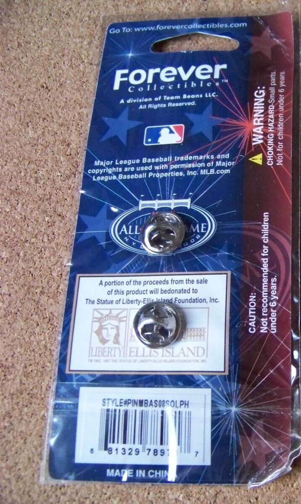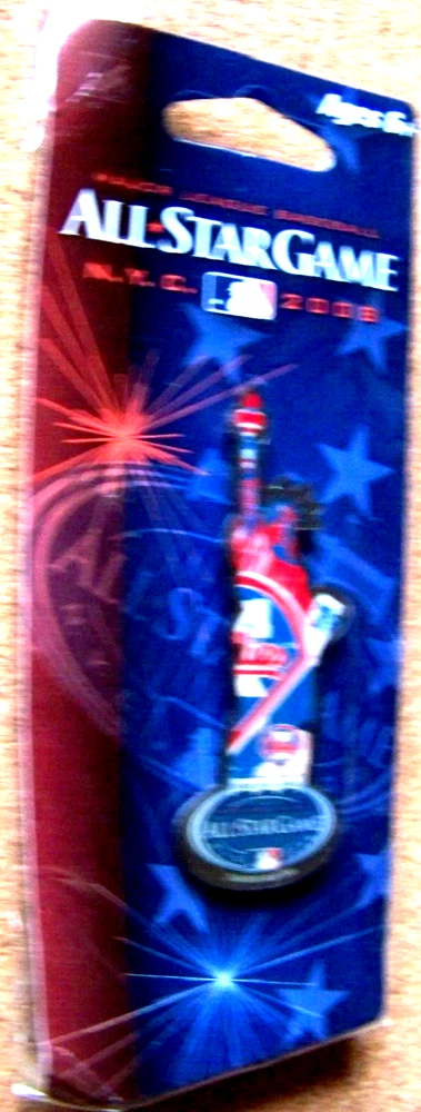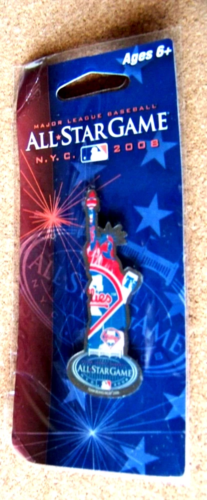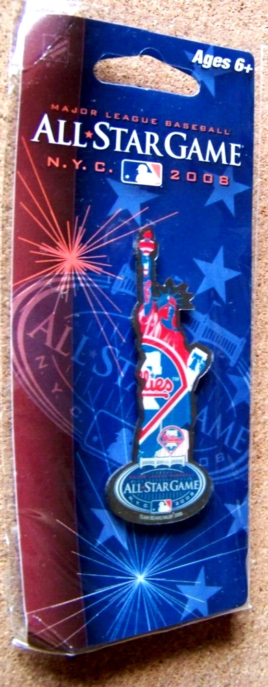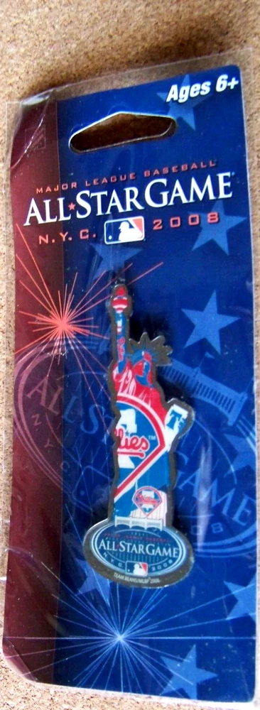 2008 All-Star Game Philadelphia Phillies Statues on Parade pin. This MLB licensed double post and butterfly clip backed pin measures about 1" wide, by 2-1/2" long. and is rimmed/backed in shiny silver tones. New, unopened but the backing card has two small creases across the left side corners. Included in the design are various logos of the Phillies. This pin is one of a series of 42, each design of which replicates the Statues on Parade statues. There is one pin for each of the different 8-1/2' Statue of Liberty statues that were set up around New York City. Finding all the 9" replica statues, aside from the New York related team designs and All Star Game itself designs, is difficult and next to impossible, but the lapel pins are even worse. Check out my other listings for the availability of other teams in both the statues and pins. At the bottom is the "Major League Baseball" version of the 2008 All-Star Game logo. Comes in original resealable packaging. The scan usually shows shiny surfaces - silver tones as dark. N.Y., N Y, AllStar, Major League Baseball, NYC, N.Y.C., N. Y. C. AS A.S. A S A. S. Don’t forget to click on my "Stores" link, next to my eBay name, to see other items I currently have listed for sale, or you can copy and paste this address into your browser: stores.ebay.com/highcountrycollectibles SHIPPING INFORMATION Shipping to U.S. addresses is FREE! HIGH COUNTRY COLLECTIBLES Since 1989 – A LEADER IN THE DENVER SPORTS MEMORABILIA MARKET. Check out my other auctions and listings, and keep an eye out for the different, unusual, and EXCLUSIVE items available nowhere else but from High Country Collectibles