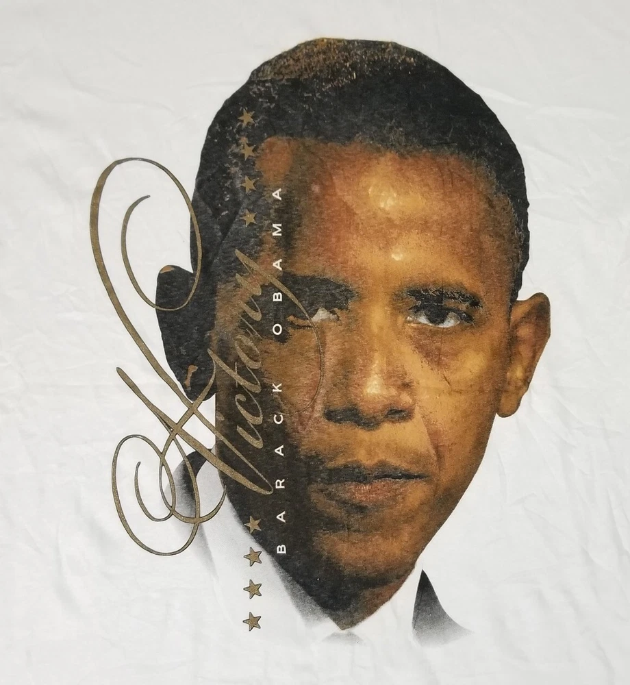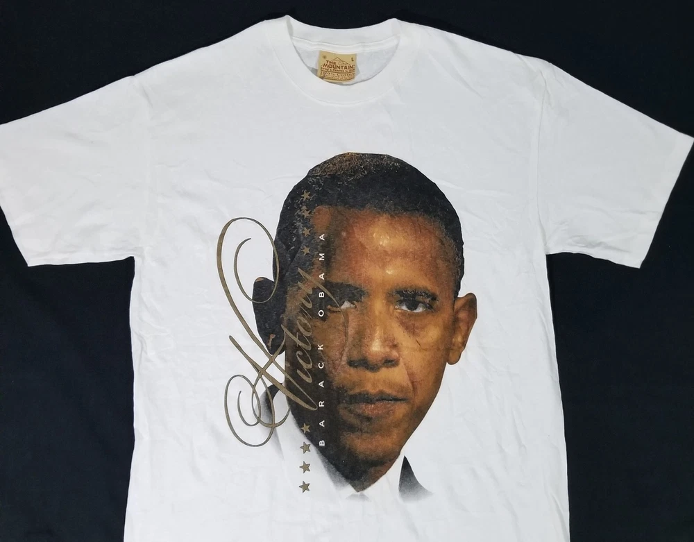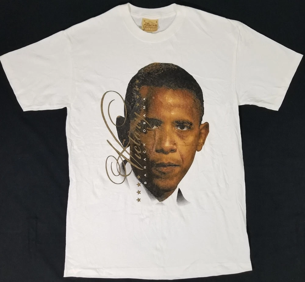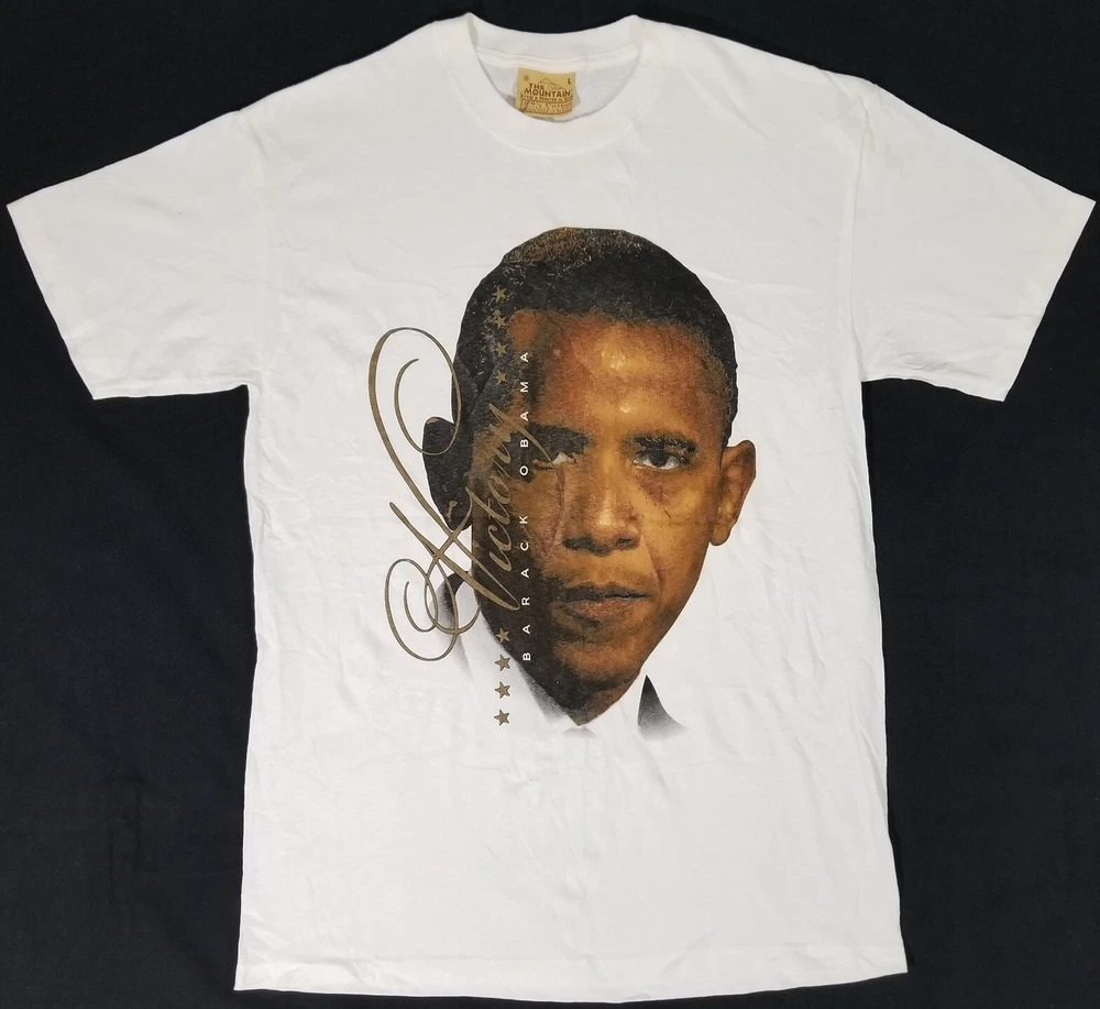 2008 Barack Obama VICTORY Presidential Election Hype The Mountain T-Shirt Men L Measures Approx: Total Length - 32 inches Arm Pit to Arm Pit - 21 inches Shirt is Super Clean and in Excellent Used Overall Condition! Please see pics for details...