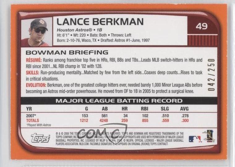 2008 Bowman - [Base] - Orange #49 Lance Berkman Qty Made: 250 - Baseball Card - Featuring the Houston Astros - Featuring Lance Berkman Search for more: 2008 Bowman Search for more: 2008 Bowman - [Base] - Orange View all of our Listings Auctions Buy It Now About Us Located in the beautiful Pacific Northwest, COMC (Check Out My Cards) is the world's largest consignment service for trading card singles. More than 10,000 people have used our consignment service to list over 50 million trading cards. Find out how we can help you consign your items on eBay by contacting us through eBay messaging. COMC -- "The Safe & Easy Way to Buy & Sell" Representative Image - Select Specific Item above to see image of actual item Representative Image - Select Specific Item above to see image of actual item Raw Condition for Modern Cards Unless otherwise noted, raw modern cards are listed in Near Mint-Mint condition or better. A NM-MT card appears to be Mint at first glance, but upon closer inspection, may exhibit some of the following: minor print defects (e.g. roller marks, print line, dimple), minor scratches, slight edge wear, and slight corner wear. Centering is clearly visible in the images provided and does not factor into our condition assessment. Raw Condition for Vintage Cards Unless otherwise noted, raw vintage cards are listed in Excellent condition or better. An EX card may exhibit some of the following: minor rounding of corners, surface wear, print defects, light scratches, and slight edge wear/chipping. Centering is clearly visible in the images provided and does not factor into our condition assessment. Domestic Shipping Combined shipping for multiple items is available. To receive combined shipping, please ensure all desired items are in your eBay shopping cart before proceeding to checkout. eBay limits orders to 40 items per order. We automatically combine multiple orders placed on the same day. If you place multiple orders on the same day, please contact us to request a refund of applicable shipping costs. Signature confirmation may be required on invoices over $400. All cards are protected and shipped securely. International Shipping COMC offers eBay's International Shipping (EIS) for international orders under $2,500* (see country exceptions below). All duties and import fees are paid at checkout; in the rare event that there are additional import fees upon delivery, these are borne by the buyer. EIS packages route through a shipping hub in Erlanger, KY before shipping to their final destination. Please note that EIS does not allow for combined shipments. The shipping rates are determined by eBay and cannot be adjusted. *Maximum sale price exceptions: Colombia, Kuwait ($2,000); Taiwan ($1,539); Chile, Costa Rica, Guatemala, Honduras, Trinidad and Tobago ($1,000); Antigua and Barbuda, Aruba, Belize, Dominica, Grenada, Philippines, Saint Kitts and Nevis, Saint Lucia, Montserrat, Turks and Caicos Islands ($500); Dominican Republic, El Salvador ($200). Please request a shipping quote through eBay messaging for orders that exceed the maximum sale price supported by eBay's International Shipping. You will be responsible for all duties and import fees for international orders shipped outside the EIS. All cards are protected and shipped securely. Payment COMC does not accept offers on our cards through our eBay storefront. COMC utilizes eBay’s managed payments system. If you are experiencing difficulties making a payment, please contact eBay for assistance. Return Policy Returns are only accepted on the rare occasion the item is not as described. If you are making a return, please initiate the return process through eBay so a mailing label can be provided for you. Prior to listing, our expert team carefully assessed this item to represent it accurately. Please review the description and high-definition images prior to purchasing to ensure this item meets your satisfaction. We welcome you to contact us if you have further questions about this item. Trust and Integrity COMC carefully assesses each item consigned to us to prevent fraudulent items from entering the marketplace. If you believe an item offered on COMC may be fraudulent, please contact us with details so we can investigate the issue. Items we determine are outside our supported items policy may be removed. Last Modified: 6/10/2025 8:17:25 PM PDT