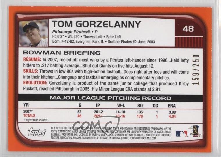2008 Bowman - [Base] - Orange #48 Tom Gorzelanny Qty Made: 250 - Baseball Card - Featuring the Pittsburgh Pirates - Featuring Tom Gorzelanny Search for more: 2008 Bowman Search for more: 2008 Bowman - [Base] - Orange View all of our Listings Auctions Buy It Now About Us Located in the beautiful Pacific Northwest, COMC (Check Out My Cards) is the world's largest consignment service for trading card singles. More than 10,000 people have used our consignment service to list over 50 million trading cards. Find out how we can help you consign your items on eBay by contacting us through eBay messaging. COMC -- "The Safe & Easy Way to Buy & Sell" Representative Image - Select Specific Item above to see image of actual item Representative Image - Select Specific Item above to see image of actual item Raw Condition for Modern Cards Unless otherwise noted, raw modern cards are listed in Near Mint-Mint condition or better. A NM-MT card appears to be Mint at first glance, but upon closer inspection, may exhibit some of the following: minor print defects (e.g. roller marks, print line, dimple), minor scratches, slight edge wear, and slight corner wear. Centering is clearly visible in the images provided and does not factor into our condition assessment. Raw Condition for Vintage Cards Unless otherwise noted, raw vintage cards are listed in Excellent condition or better. An EX card may exhibit some of the following: minor rounding of corners, surface wear, print defects, light scratches, and slight edge wear/chipping. Centering is clearly visible in the images provided and does not factor into our condition assessment. Domestic Shipping Combined shipping for multiple items is available. To receive combined shipping, please ensure all desired items are in your eBay shopping cart before proceeding to checkout. eBay limits orders to 40 items per order. We automatically combine multiple orders placed on the same day. If you place multiple orders on the same day, please contact us to request a refund of applicable shipping costs. Signature confirmation may be required on invoices over $400. All cards are protected and shipped securely. International Shipping COMC offers eBay's International Shipping (EIS) for international orders under $2,500* (see country exceptions below). All duties and import fees are paid at checkout; in the rare event that there are additional import fees upon delivery, these are borne by the buyer. EIS packages route through a shipping hub in Erlanger, KY before shipping to their final destination. Please note that EIS does not allow for combined shipments. The shipping rates are determined by eBay and cannot be adjusted. *Maximum sale price exceptions: Colombia, Kuwait ($2,000); Taiwan ($1,539); Chile, Costa Rica, Guatemala, Honduras, Trinidad and Tobago ($1,000); Antigua and Barbuda, Aruba, Belize, Dominica, Grenada, Philippines, Saint Kitts and Nevis, Saint Lucia, Montserrat, Turks and Caicos Islands ($500); Dominican Republic, El Salvador ($200). Please request a shipping quote through eBay messaging for orders that exceed the maximum sale price supported by eBay's International Shipping. You will be responsible for all duties and import fees for international orders shipped outside the EIS. All cards are protected and shipped securely. Payment COMC does not accept offers on our cards through our eBay storefront. COMC utilizes eBay’s managed payments system. If you are experiencing difficulties making a payment, please contact eBay for assistance. Return Policy Returns are only accepted on the rare occasion the item is not as described. If you are making a return, please initiate the return process through eBay so a mailing label can be provided for you. Prior to listing, our expert team carefully assessed this item to represent it accurately. Please review the description and high-definition images prior to purchasing to ensure this item meets your satisfaction. We welcome you to contact us if you have further questions about this item. Trust and Integrity COMC carefully assesses each item consigned to us to prevent fraudulent items from entering the marketplace. If you believe an item offered on COMC may be fraudulent, please contact us with details so we can investigate the issue. Items we determine are outside our supported items policy may be removed. Last Modified: 6/10/2025 8:17:19 PM PDT