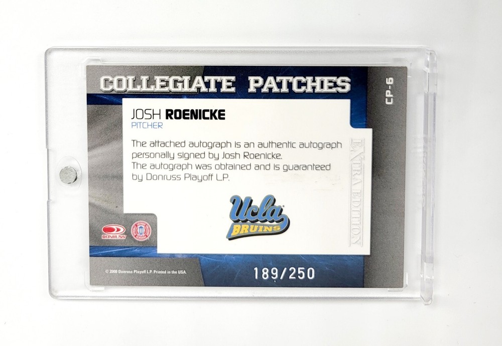 Up for sale is a rare and highly sought-after trading card featuring Josh Roenicke, a former UCLA Bruins baseball player who later joined the Seattle Mariners. This limited edition 2008 Donruss Elite Extra Edition Collegiate Patch card is serial numbered and includes a hard-signed autograph, making it a must-have for any serious collector. The card features a stunning patch variety and is part of a set of only 250 prints. Don't miss out on this opportunity to own a piece of baseball history! One touch not included. Card will be well protected and shipped in top loader case.