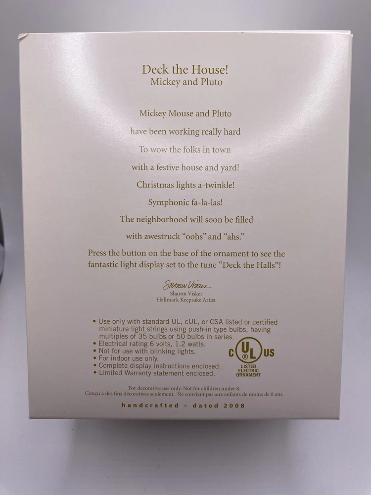 Handmade: No Collection: Mickey & Pluto Personalize: No Antique: No Brand: Hallmark Color: Multicolor Pattern: n/a Type: Ornament Theme: Christmas Shape: house Features: Light Up, Sound Size: Large Item Width: 3 in Material: Mixed Materials, Plastic MPN: QXD4071 Number of Items: 1 Department: Adult Age Level: Over 18 Years Character: Pluto Year Manufactured: 2008 Country/Region of Manufacture: China Original/Licensed Reproduction: Original Time Period Manufactured: 2008 Franchise: Disney Subject: Decorating Item Height: 4 in Production Technique: n/a Occasion: Christmas Vintage: No Item Length: 4 in UPC: 795902018856 Set Includes: 2008 Deck the House! Mickey and Pluto Ornament - MAGIC Light & S gtin13: 795902018856