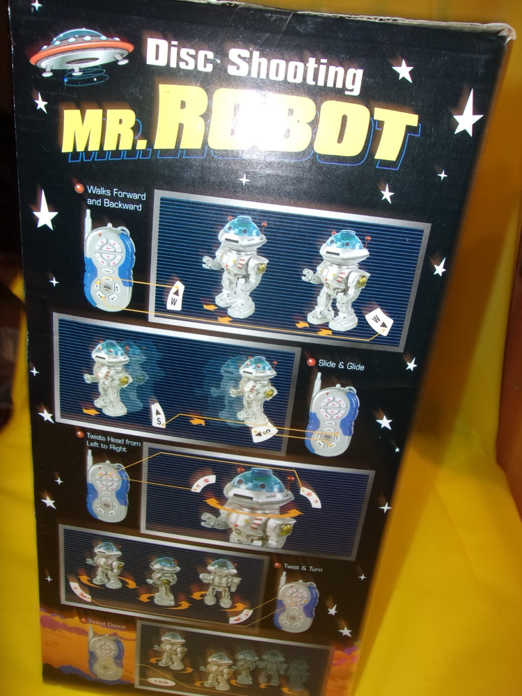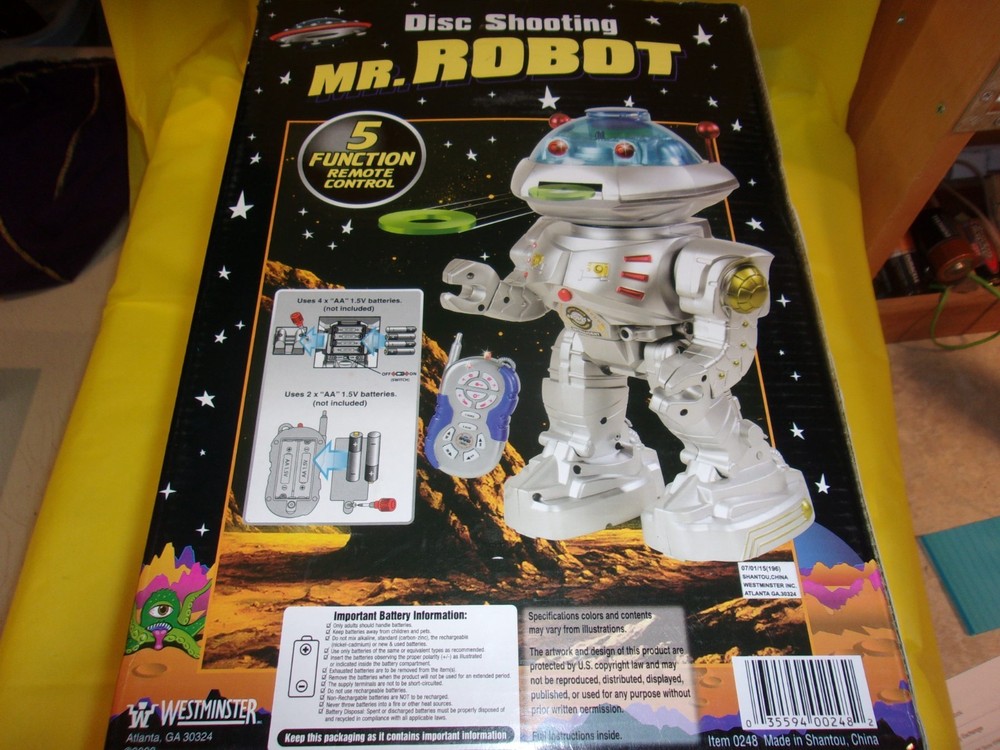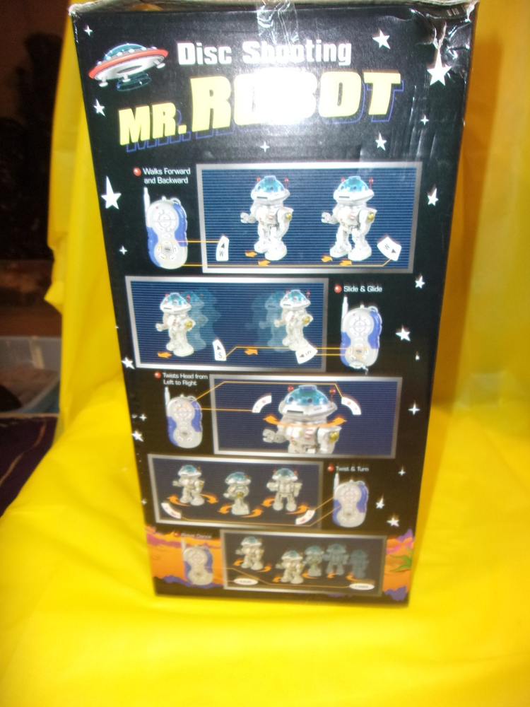 This offering is for a>>>>>>> 2008 NEW OLD STOCK IN ORIGINAL BOX MADE IN CHINA BY WESMINSTER DISC SHOOTING FIVE FUNCTION "MR.ROBOT" BATTERY OPERATED TOY ROBOT IN ORIGINAL BOX.THE TOY IS UNTESTED.THE TOY IS IN NEW UNUSED CONDITION.THE ORIGINAL BOX HAS SUPER GRAPHICS AND IN IS NICE CONDITION. PLEASE SEE PHOTOS TO MAKE YOUR OWN DETERMINATION OF COMPLETENESS AND CONDITION.IF YOU HAVE ANY QUESTIONS PLEASE FEEL FREE TO ASK. THIS ITEM HAS NEVER BEEN OFFERED ON EBAY BEFORE NOW.I JUST PURCHASED A SMALL COLLECTION OF ROBOTS THAT I WILL BE LISTING OVER THE NEXT FEW WEEKS!! YOU ARE BUYING THE EXACT ITEM PICTURED!!!! I AM ALWAYS GLAD TO COMBINE SHIPPING!! Buyer pays actual USPS PRIORITY MAIL SHIPPING FEES
