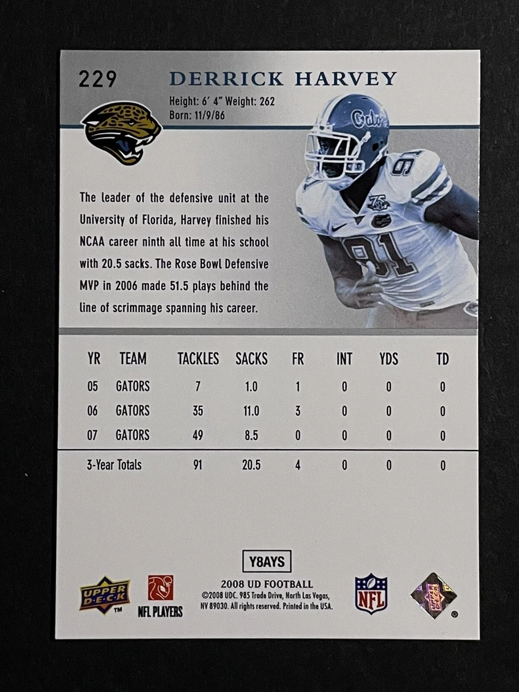 2008 Upper Deck Derrick Harvey Star Rookie Card - Florida Gators/ Jaguars