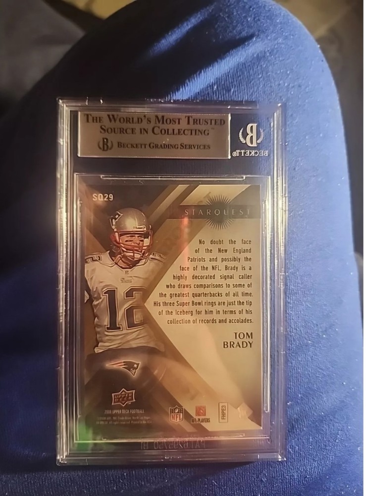The product is a 2008 Upper Deck Starquest Rainbow Gold trading card featuring Tom Brady, a football player. The card is numbered SQ 29 and has been authenticated and graded as PSA 9. It belongs to the Sports Trading Card category and is a highly sought-after collectible for fans of sports trading cards, specifically those interested in football and the player Tom Brady. The card's design includes a gold rainbow parallel variety, adding to its appeal among collectors.