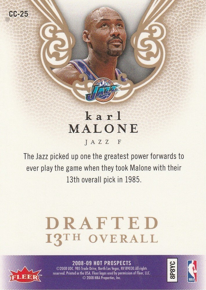 Team:Utah JazzFeatures:Single-InsertType:Sports Trading CardCard Number:CC 25Set:2008-09 Hot Prospects Cream of the CropLeague:National Basketball Association (NBA)Player/Athlete:Karl MaloneSport:BasketballManufacturer:Fleer