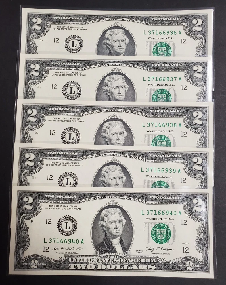 Nice Find: Sequential Lot of 5 - 2009 $2 Federal Reserve Notes (LA Block) San Francisco District. All Crisp GEM UNC Notes. Excellent Paper Quality. Each Note Comes shipped in a Guardhouse Top Loader Currency Holder. *** INTERNATIONAL SHIPPING QUOTED*** Thank you for viewing... Please email any questions you may have.... Take a moment and check out our other unique auctions !!! ***** Email us about signing up for our mailing list******* Exciting new items every day Philately - The Quiet Excitement Shipping We try to Ship Within 5 Business Days of Cleared Payment Will calculate international shipping PLEASE READ International Buyer's Shipping Instructions International shipping "" First Class Registered ENVELOPE " NO EXCEPTIONS ! ** Insurance, Registered mail or Confirmation/Signature Guarantee is included in the price of shipping for the USA only ** Our goal is to please our customers, provide quality and unique items, have successful transactions and earn positive feedback with a 5 star rating. We strive for accurate descriptions, quick turnaround, detailed communication, and reasonable shipping charges on every lot. Your feedback is important to us. If you feel anything about the transaction was less than 5 star, please give us the opportunity to rectify the situation Thank you The Staff at Henry Gitner Philatelists, Inc.