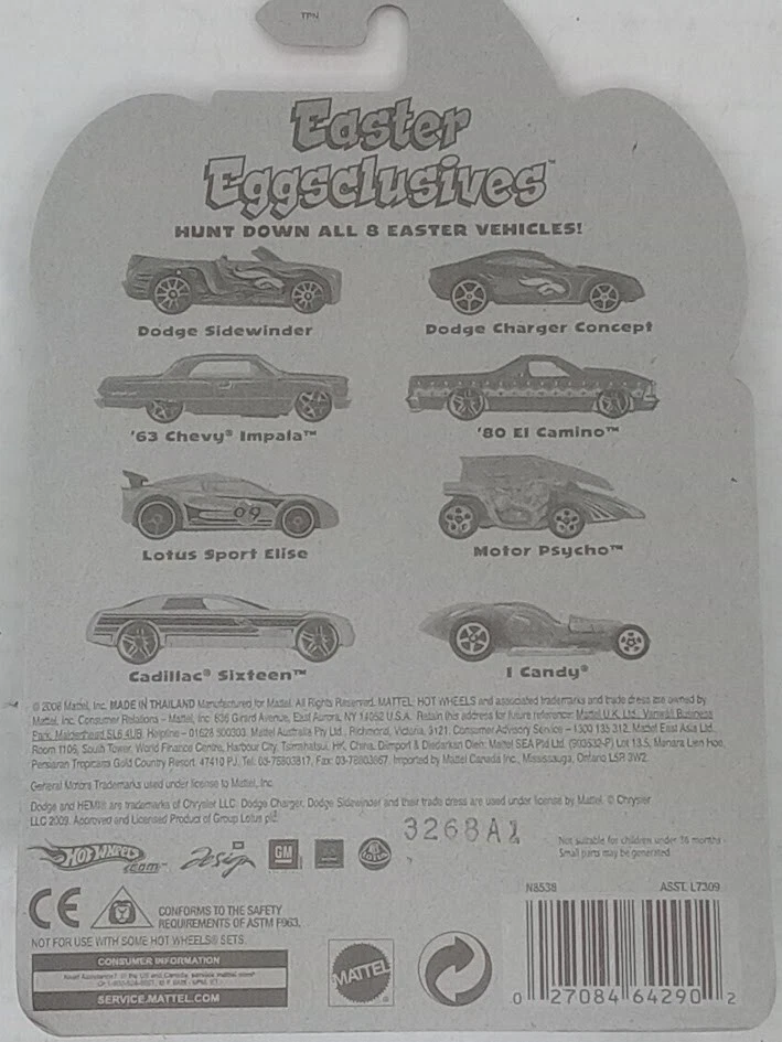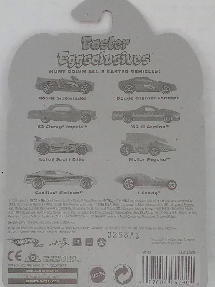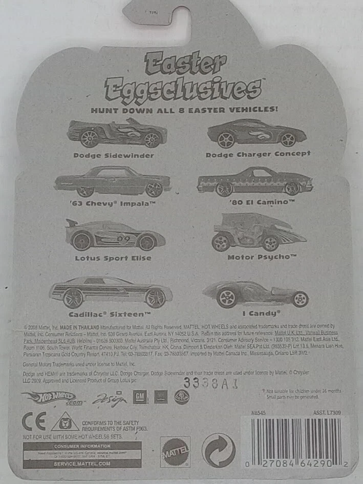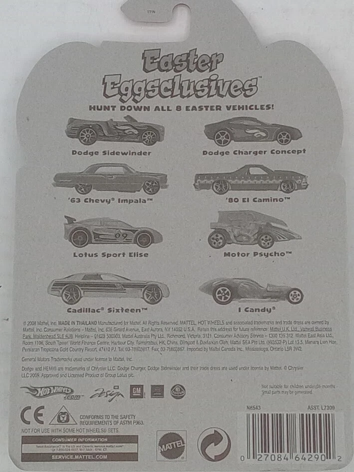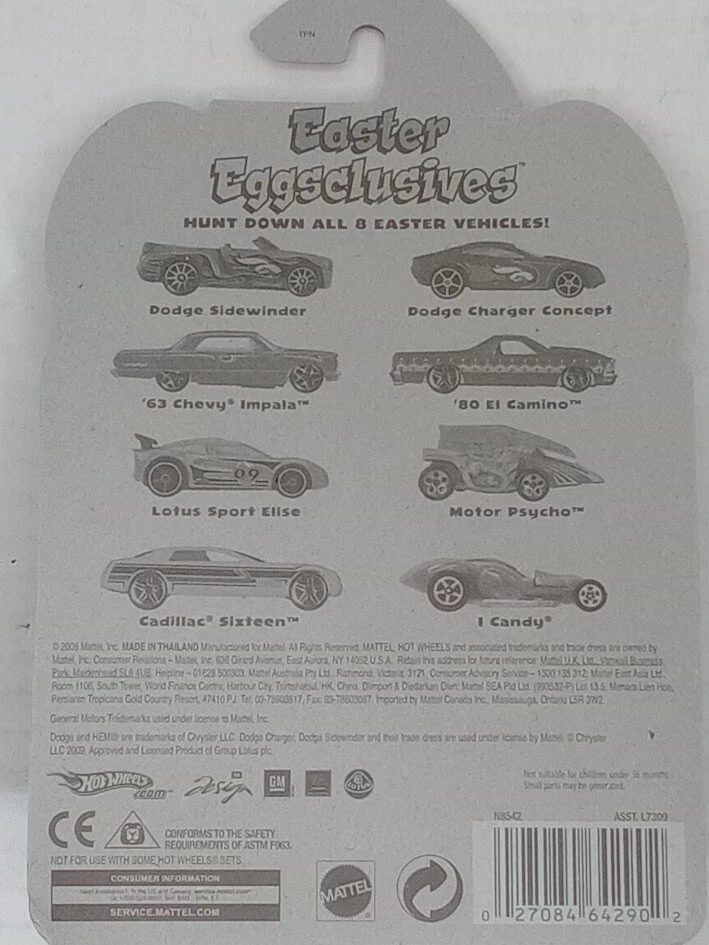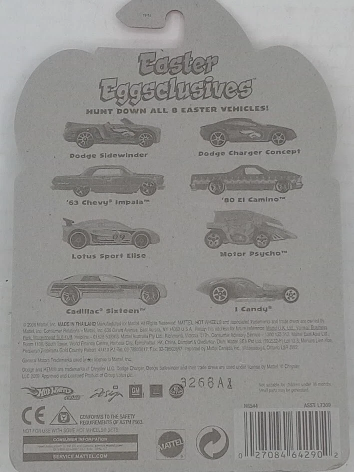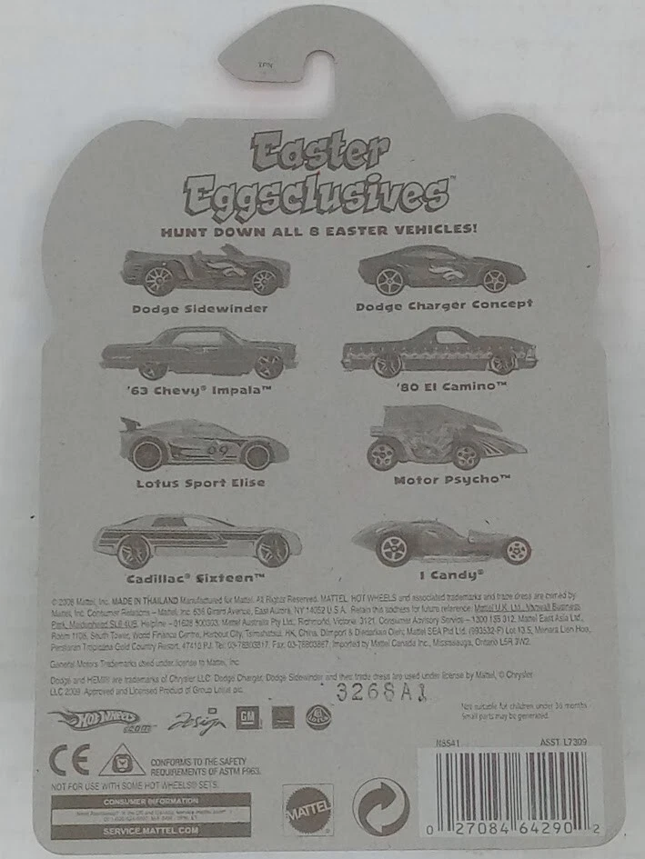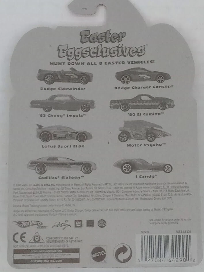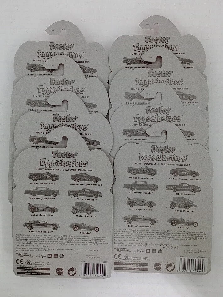 2009 Hot Wheels EASTER EGGSCLUSIVES Die-Cast Car Set (1-8) with Chevy Impala SKU#101068 Look closely at the pictures to see further details. We ships USPS PLEASE see photos for detailed condition!! AC PLEASE LOOK AT THE PHOTOS CAREFULLY BEFORE PURCHASING!! If you are purchasing more than one item from us and would like combined shipping, PLEASE request an adjusted invoice from us while still in the cart and BEFORE paying. eBay does not usually calculate combined shipping accurately and you might get overcharged. Please be aware that when we photograph items, we use lighting that will show the details well. Although we try to present the product as accurately as possible, the lighting may affect the overall look of the item by appearing lighter/darker or possibly a different hue than the actual item. Depending on the type of lighting you have in your home, there may be some differences between the photos and the actual item. If this is a concern of yours, please feel free to request additional photos made in natural lighting or ask for a more detailed description of the item PRIOR TO PURCHASE! PLEASE NOTE: We greatly appreciate your interest in our item for sale. We look forward to a pleasant, quick and satisfying transaction for everybody, so please note the following information before bidding. Thank you! ITEM DESCRIPTIONS: * We will try to describe items well and provide plenty of photos. Please review these carefully before bidding or purchasing. * Only the items pictured and described are what you will receive when purchased. * We will occasionally offer an item clearly marked "AS-IS". This means that we are not sure if it works because we are unable to test it for whatever reason. We will offer these at a discounted price then a similar "working" item. It is possible that these items will work fine, but it also is possible that these items are more useful for their parts. Please only bid on or purchase these items if you are well aware of this, as we will only provide refunds of actual item price (no shipping cost refunds) for these items. * If you have any questions that aren't addressed by the descriptions or photos, please feel free to ask before you bid. * There may be bends, dents or parts of the blister that have minor issues due to long term storage. Such things will be pointed out under the description, please look closely at the pictures for further details. SHIPPING: * We usually do not offer shipping to international addresses, but ARE WILLING TO TAKE CONSIDERATIONS. * We try to pack items as carefully as possible, but damage may occur during shipping. If you receive an item that was damaged in shipping, please contact us and we will work with you to resolve the problem. * We will combine shipping costs for all items the same buyer purchases from us within 2 days. Please wait to pay for items until you're done shopping with us. Please contact us if you're expecting to buy more items from us, or to have us adjust the shipping costs. * We will usually ship items out within 24 hours of payment being received Sunday through Friday at noon. We will notify the buyer if there will be a delay in shipping for some reason. Please allow additional time for holidays and weekends when the post office is closed. If payment is received after noon (EST) on Friday, the item might not be shipped until the following Monday. * We do try to recycle shipping materials as much as possible. RETURNS: We abide by eBay's Money Back Guarantee. We definitely want our customers to be happy with their purchase! You may return an item within 30 days of receiving it with the following guidelines: * If the item is defective or damaged (unless we clearly marked the listing "AS-IS"), the buyer will receive a full refund after the buyer returns it and it is received by us. Customers who falsely claim their item is defective, damaged, or not as described in order to receive a full refund and free return shipping will be permanently blocked from making future purchases from us. * If the item is as described (including "AS-IS" items) and the buyer decides for any other reason than defective/damaged to return it, only the actual price of the item will be refunded once it has been returned and it is received by us. The buyer will be asked to pay all original and return shipping charges. This includes all reasons other than defective/damaged, including wrong size, wrong type, changed mind, etc. All "AS-IS" items will fall into this category of return. Please make sure the item is what you want before purchasing it. * Please contact us before initiating a refund request. FEEDBACK: We always leave feedback at the end of transaction. We consider the transaction to be over when we receive feedback from the buyer confirming the item arrived satisfactorily. If you are unsatisfied with your purchase please contact us before leaving neutral or negative feedback. WE APPRECIATE POSITIVE FEEDBACK IF YOU ARE SATISFIED WITH YOUR PURCHASE! THANK YOU FOR YOUR INTEREST IN THIS ITEM! !