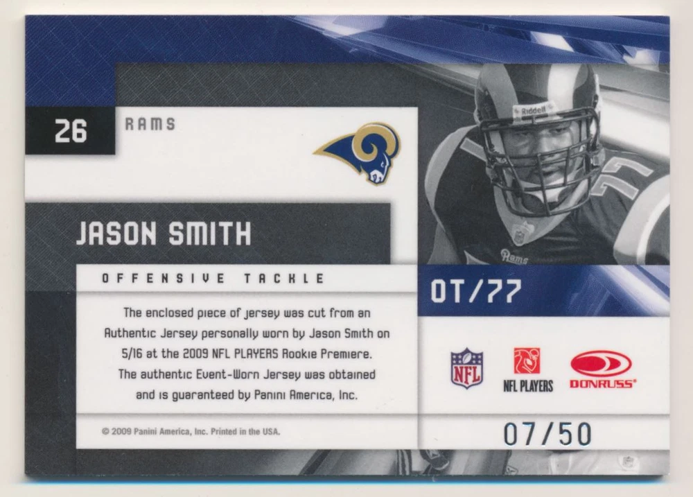 Player: Jason Smith Brand: Limited Product: Single Item Condition: Near Mint/Mint Card Manufacturer: Panini Group Period: Modern (1970-Now) Sport: Football Graded: No Grade: Near Mint/Mint Item Attributes: Memorabilia, Serial Numbered Year: 2009 Team: St. Louis Rams Original/Reprint: Original