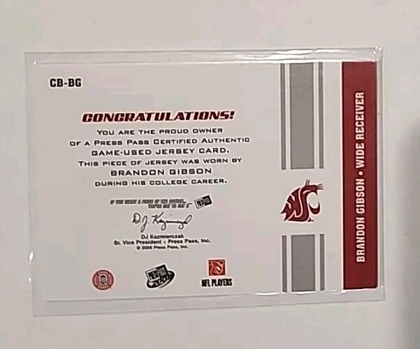 This 2009 Press Pass Authentics Gridiron Gamers sports trading card features Brandon Gibson of the Washington State Cougars. The card is a rookie card and also includes memorabilia from the player. It is a great addition to any football fan's collection, especially those who are fans of the National Collegiate Athletic Association (NCAA). The card is from the 2009 season and is numbered CB-BG. It is a must-have for collectors of sports trading cards, especially those who are looking for a unique and valuable item.