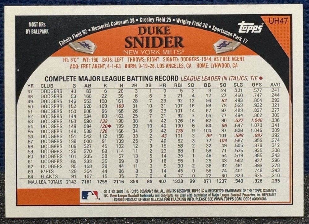 PLEASE REVIEW PICTURES TO DETERMINE ITEM CONDITION. THIS IS THE ACTUAL ITEM BEING OFFERED FOR SALE. This is a 2009 Topps Update Series baseball trading card featuring Duke Snider of the New York Mets. It is a short print photo variation card (#UH47) made of 20 Pt. card stock. The card is an original release by Topps and is in English. It is a modern era sports trading card from the Major League, with a unique design specific to the Topps Update Series.