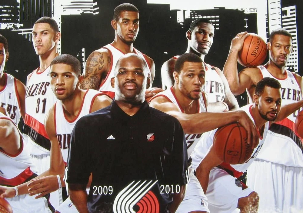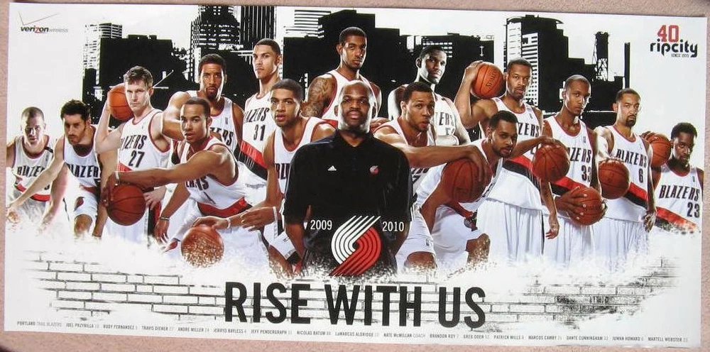 This new Portland Trailblazers official 2009-10 TEAM poster was available one day as a Rose Garden home game handout. Each year the Blazers issue a team poster and this one pictures the Blazers of 2009-10 with all fifteen players and Coach Nate McMillan shown. Each player’s name and uniform number is listed at the bottom. Among those pictured are Greg Oden / Brandon Roy / LaMarcus Aldridge / Andre Miller / Rudy Fernandez / Marcus Camby / Joel Pryzbilla / Nicolas Batum / Martell Webster / Juwan Howard / etc. Size is 38” by 18”. It is in great condition for display, at least Mint/Near-Mint. It will shipped rolled in a sturdy tube. See my EBAY Store and current listings to save shipping on multiple items. Shipping includes private insurance.