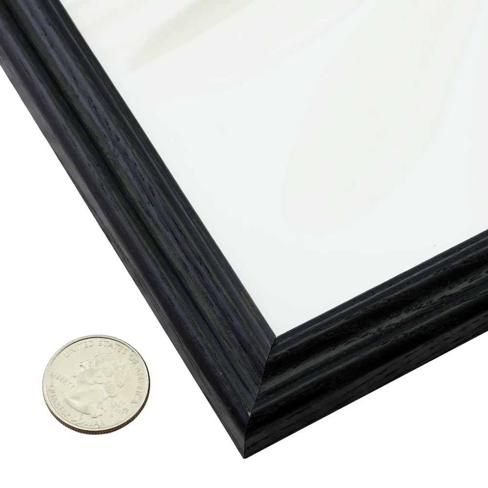 Traditional style, shiny black with wood grain finish Frame includes: glass, rigid black backing and pre-attached stamped hanging hardware Fits a 6x18 Photo/Print/Poster; (Viewable area is slightly smaller) Frame molding is 0.75 Inch wide, Real ash, Solid wood Frame measures 6 Inch by 18 Inch