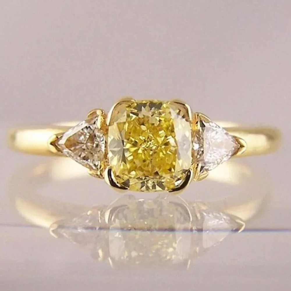 Elevate your special moments with the 2.00Ct Cushion Canary Diamond Three Stone Engagement Ring, exquisitely crafted for a touch of elegance. The ring features a captivating cushion-cut citrine, embraced by two dazzling lab-created diamonds, offering a brilliant trio of gems totaling 2.50 carats. Set in lustrous 14K yellow gold plating, the ring is a timeless testament to classic sophistication. Each element of this ring is designed to perfection, from the excellent cut grade ensuring maximum sparkle to the meticulous prong setting that secures the stones. Available in all ring sizes, this piece is a perfect choice for anniversaries, birthdays, or promises. With the option for personalization, this engagement ring is not just a jewelry piece, but a statement of love, handcrafted to order in the United States.