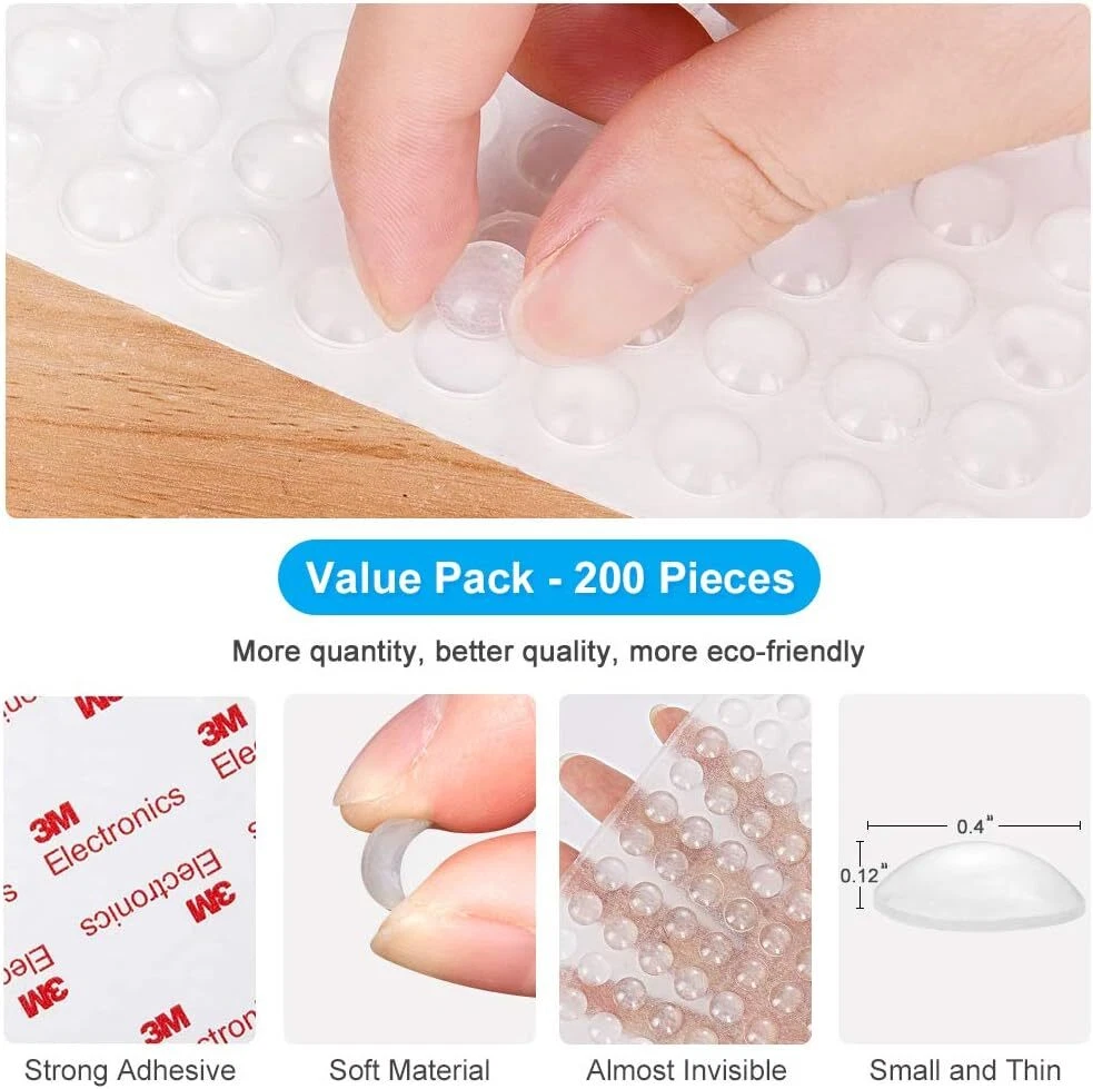 200PCS Cabinet Bumpers Clear Rubber Self Adhesive, Soft Round Product Details Brand: FATLODA Material: Silicon Color: Round Surface Recommendation: Hardwood Shape: Round BEST VALUE PACK- FATLODA 200 PCS pack contains clear cabinet door bumpers of 3/8 inch in diameter and 3mm/0.1" in thickness. The clear bumpers self adhesive suitable for cabinets, drawers, cupboard doors, table tops, laptop, cutting boards, picture frames, etc. STRONG SELF ADHESIVE- FATLODA rubber cabinet door bumpers are easy to use with the built in self adhesive that easily sticks to tables, desks, banisters, cabinets or any other furniture that needs cushioning or sound dampening. The cabinet rubber bumpers are suitable for sticking to glass, wood, metal, ceramics, granite, etc. SOUND DAMPENING & CUSHIONING- FATLODA silicon cabinet door bumpers clear not only help to reduce the noise caused by a closing cabinet door, but also prevents surface damage in some cases behind doors, drawers, tables. These kitchen cabinet stoppers rubber can maximize prevent damage to furniture. CONCEAL DESIGN- FATLODA cabinet pads for doors design is like a clear color like a drop of water, which can be integrated with any color without affecting your beautiful home decoration. Just peel off the drawer bumpers for cabinets and paste it where you need it. Easily tear off without leaving a trace. CUSTOMER SERVICE- FATLODA take pride in providing the highest quality and most durable cabinet bumpers sound dampening on the market. If you have any problem at all, please contact us so that we can resolve your problem.