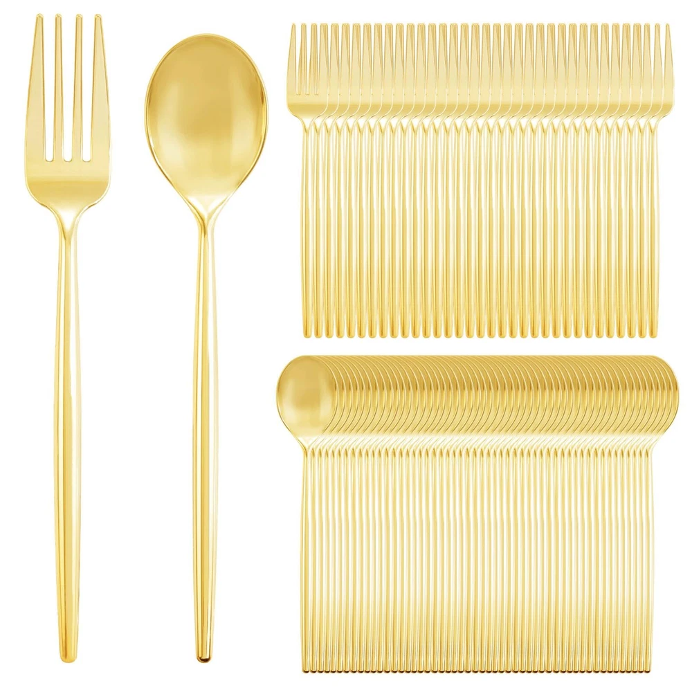ELEGANT & DURABLE: These gold plastic spoons and forks set look like real metal flatware, bringing elegance to your dining table. These gold plastic silverware are well crafted and structurally sturdy. VALUE PACKAGING:These gold disposable spoons and forks include 100 golden plastic forks and 100 golden plastic spoons, suitable for your gatherings and daily use.These gold disposable cutlery are suitable for use in birthdays, parties, banquets, weddings, and other occasions. PREMIUM MATERIAL:Gold plastic flatware are made of 100% food , BPA free, and durable plastic, with smooth edges and bright colors. Gold plastic utensils will not scratch or easily break, ensuring a safe and enjoyable dining experience for you and your guests! DISPOSABLE & EASY TO CLEAN: These gold plastic silverware heavy duty are disposable, and after the party, you can throw them away directly to save your time. But these gold plastic flatware can also be reused, as long as you clean them after use. REASSURING AFTER-SALES SERVICE: Customer satisfaction is our greatest pursuit. If you have any questions about our Heavey duty plastic utensils sets or any suggestions for you can us, we serve you religiously.
