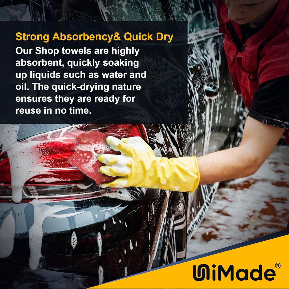 Powerful Cleaning: Unimade commercial grade microfiber cleaning cloths boast exceptional cleaning power, tackling messes with ease. From spills to stains, they deliver a thorough clean every time. Say goodbye to stubborn stains and spills with our shop towels No Scratching& Lint-Free: Our shop towels are luxuriously soft and designed to pamper without a trace. These microfiber towels for car are lint-free and can prevent residue or fibers from clinging to surfaces. Ideal for multiple tasks including car care, cleaning machinery, surface wiping, hand drying, and spill absorption Super Absorbent& Quick Dry: Crafted from premium microfiber, UNIMADE cleaning rags excel in soaking up oils, liquids, and workshop spills. Their highly absorbent qualities enhance their effectiveness in removing stubborn grime and grease Versatile Workshop Essential: UNIMADE shop rags find widespread use in automotive, workshops, garages, manufacturing facilities, housekeeping, Restaurant and diverse industrial settings, adeptly handling tasks like polishing, detailing, and various cleaning applications. Our cleaning towels are able to efficiently clean grease, oil, grime, fluid spills, tools, and parts, offering versatile and effective cleaning capabilities for various workshop needs Reusable& Cost-Efficient: Compared to paper towels, our shop towel cleaning rags are machine washable and reusable, reducing waste and ensuring long-lasting performance, making them a cost-efficient choice for your everyday routine Product Description