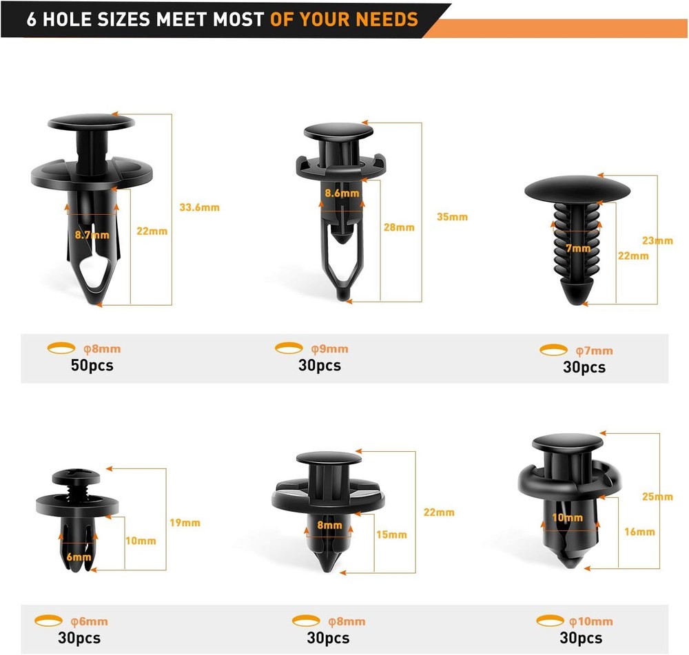 Features: 1.Made of high quality plastic material, durable and practical to use 2.Anti-wear and anti-corrosion, widely used in door trim, fenders, bumpers, radiator shields, side skirts, grilles, etc. 3.Quickly and easily remove the door panels and trim clips without damaging them. 4.Includes 6 sizes, different sizes to meet your different needs, a total of 200. 5.Save your time and money. No need to go to the auto parts store to find different clips. Specifications: 1.Colour: Black (As pictures show) 2.Material: Plastic 3.Application: Universal 4.Package Contents:200*Fastener Rivet Clips 6 Sizes: φ9mm:30PCS (high: 35mm/1.37in) φ8mm:50PCS (high: 33.6mm/1.32in) φ10mm:30PCS (high: 25mm/0.98in) φ8mm:30PCS (high: 22mm/0.86in) φ6mm:30PCS (high: 19mm/0.74in) φ7mm:30PCS (high: 23mm/0.9in) Package Included: 200x Fastener Rivet Clips Kit