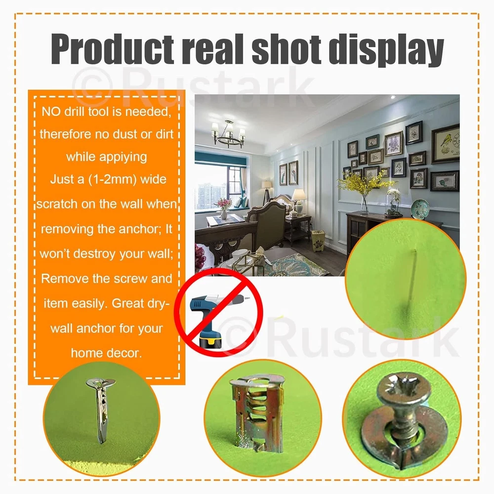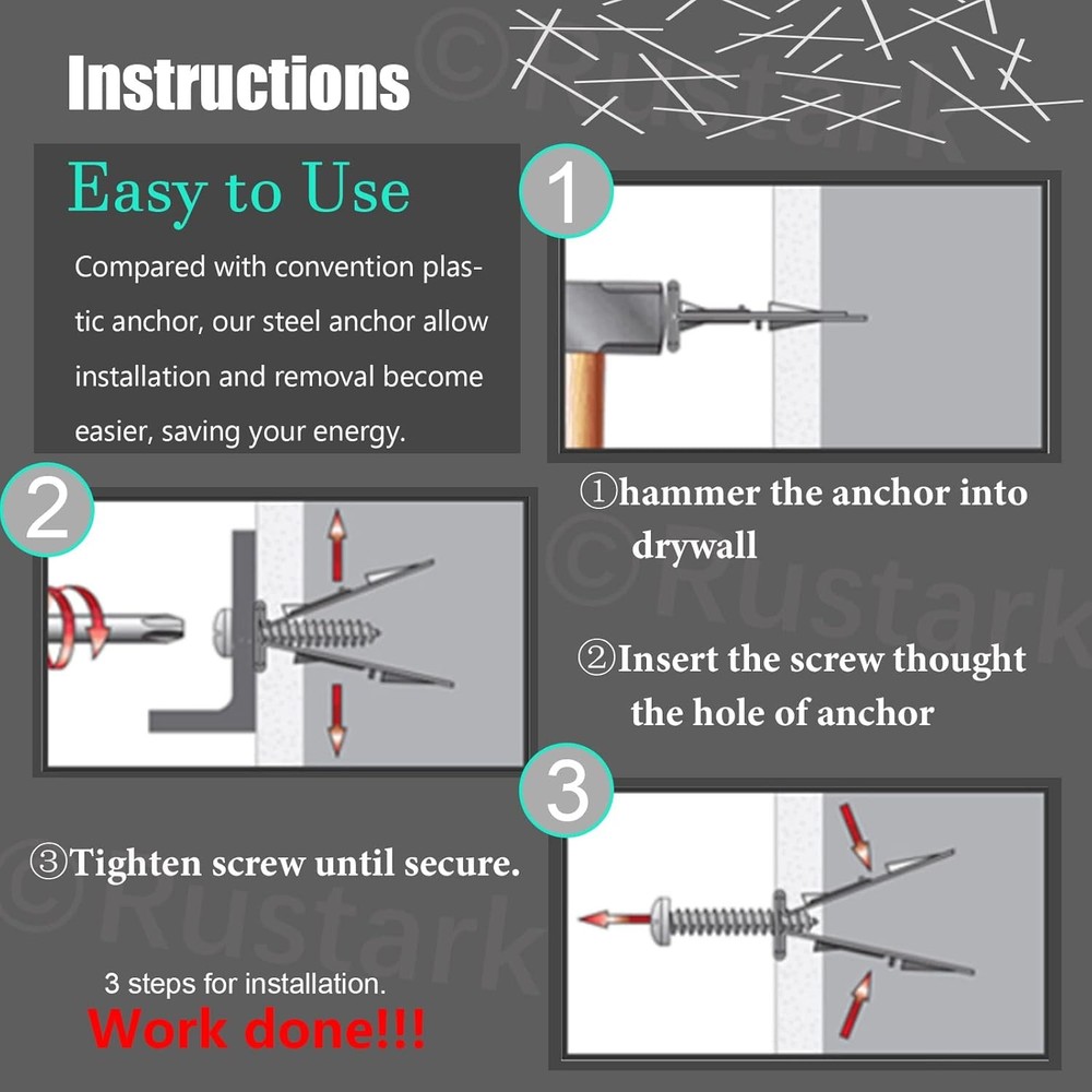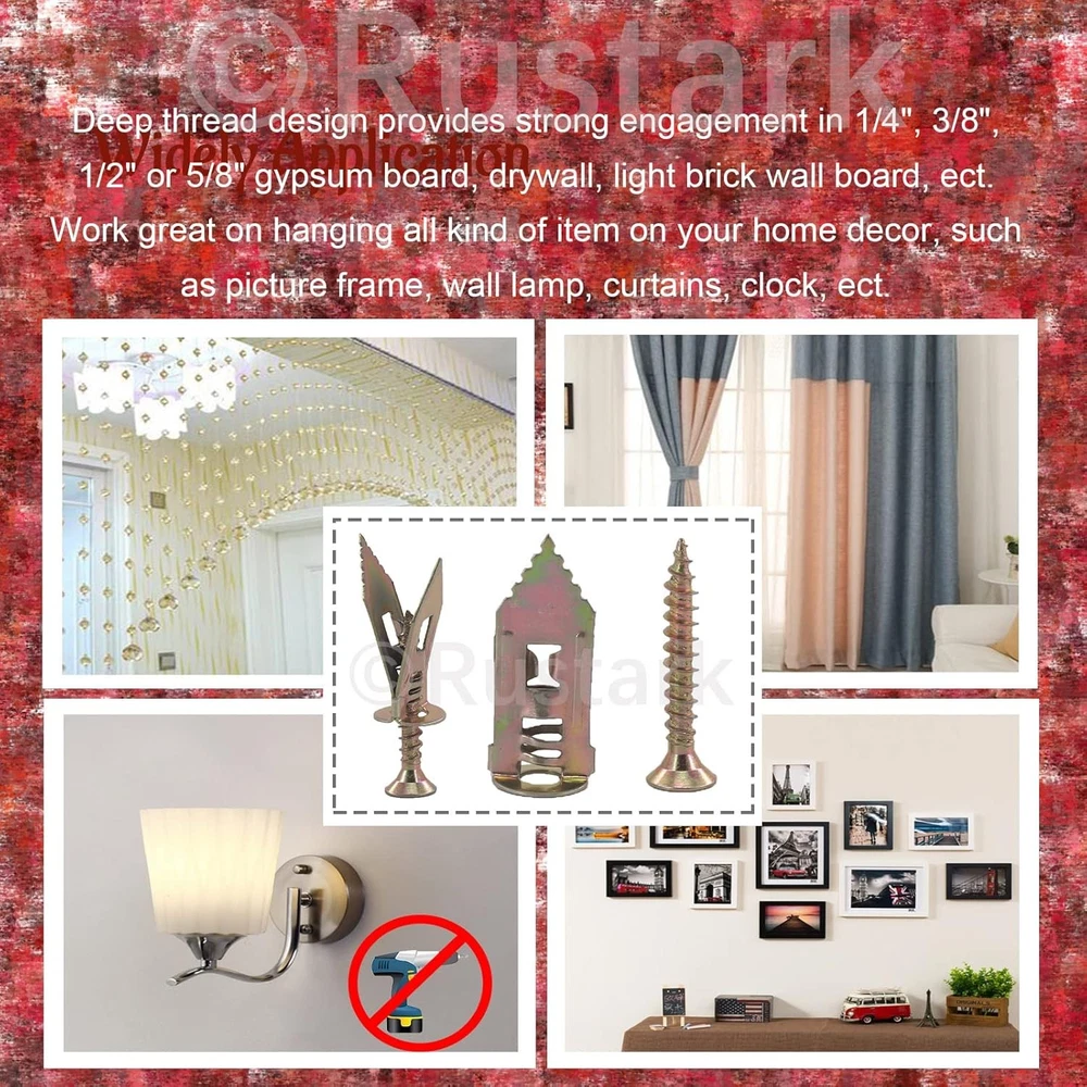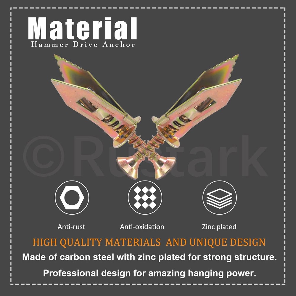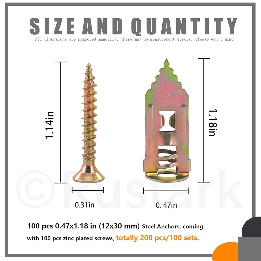 200Pcs Drywall Anchor Kit, Steel Self-Drilling Anchors with One Size, Gold Product Details Package Dimensions : 5.63 x 3.98 x 1.93 inches; 12.42 ounces Item model number : R514-DJ Manufacturer : Rustark Size: One Size Color: Gold Material: Carbon Steel, Zinc Brand: Rustark Fastener Type: Hook 【What you Get】100 pcs 0.47x1.18 in (12x30 mm) Steel Anchors, coming with 100 pcs zinc plated screws, totally 200 pcs/100 sets. In addition, offering reliable service for you, pls feel free contact us for any dissatisfaction, we will reply you within 12 hours for your satisfaction. 【Free-drilling】Free drill tool! No need to drill the holes on the wall. Just a (1-2mm) wide stratch on the wall when removing the anchor; It won’t destroy your wall; Remove the screw and item easily. Great drywall anchor for your home decor. 【Easy to Use】3 steps for installation.① hammer the anchor into drywall②Insert the screw thought the hole of anchor③Tighten screw until secure. Work done!!! Compared with convention plastic anchor, our steel anchor allow installation and removal become easier, saving your energy. 【Wide Application】Deep thread design provides strong engagement in 1/4", 3/8", 1/2" or 5/8" gypsum board, drywall, light brick wall board, ect. Work great on hanging all kind of item on your home decor, such as picture frame, wall lamp, curtains, clock, plants, ect. Rustark 100 Sets Drywall Anchor Kit, Steel Self-Drilling Anchors with Zinc Plated Screws, Wall Anchor Hooks, Heavy Duty Metal Toggle Anchors, No Drill Or Holes in Wall, Hangs up to 66 lbsProduct Specification:Name: Hammer driver anchor with screw setQuantity: 200 pcs/100 setsDimension: 0.47x1.18 in (12x30 mm) Steel AnchorsHanging Power: hang up 66lbsWhy Choose us?-----Premium Material: Made of carbon steel with zinc plated for strong structure. Excellent workmanship without any burr, convenient to apply.----- Professional design for amazing hanging power:The split in the ribbed anchors expand on two opposing sides as you tighten the screw, increasing holding power. Hangs up to 66 lbs, work great!-----Won’t destroy you wall: Free drill tool! No need to drill the holes on the wall. Just a (1-2mm) wide scratch on the wall when removing the anchor; It won’t destroy your wall;-----Easy to Use:3 steps for installation.① hammer the anchor into drywall②Insert the screw thought the hole of anchor③Tighten screw until secure. Work done!!!✎✎✎ Pls feel free contact us for any dissatisfaction. We will rely you within 12 hours for your satisfaction.★Package Includes:100 pcs steel anchor100 pcs zinc plated screwsTotally 200pcs