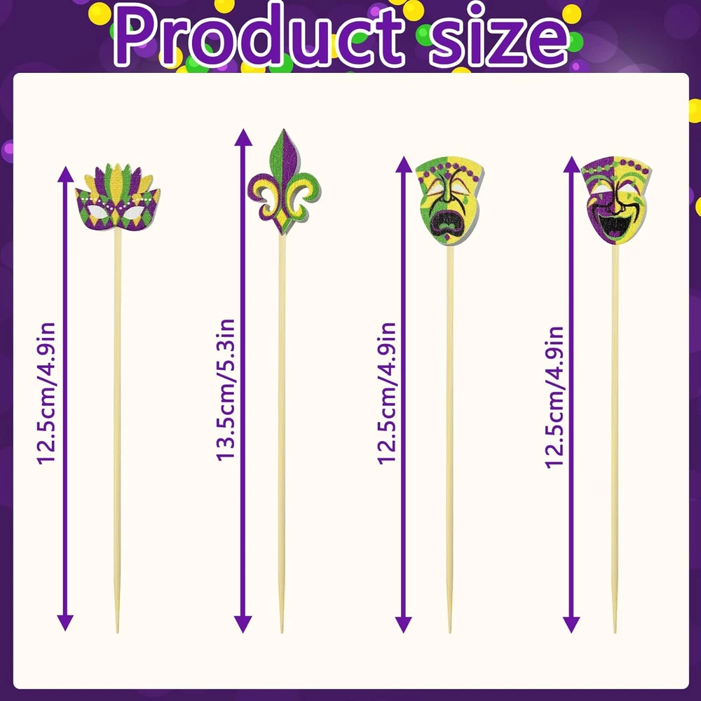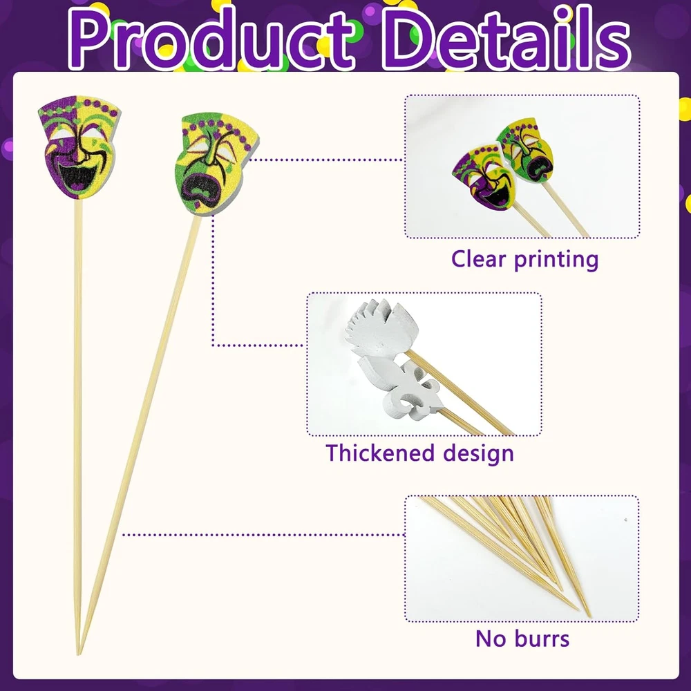 Store New Arrivals Add to Favorite View Feedback Contact Fast deliveries to the customer's home Quality customer service John Make the customers happy! 200Pcs Mardi Gras Cocktail Picks,Mardi Gras Cupcake Toppers 4.7 Inch Mardi Gras Fruit Toothpick Carnival Masquerade Decorative Toothpicks for Mardi Gras Decorations Themed Party Supplies Description MAKE YOUR PARTY ATTRACTIVE-The total number of these Mardi Gras Cocktail Picks is 200pcs, which is sufficient to satisfy your various needs.Let your appetizers and cocktail drinks be presented in a great attractive way MATERIAL-These Mardi Gras cupcake toppers are made of wood.the surface is smooth, and the heads at the end makes it easier to hold and gives you a comfortable feeling of use. they are long enough to not break easily and you can insert various foods more easily APPROPRIATE SIZE-Our Mardi Gras theme food appetizers toothpicks are about 12 cm/ 4.7 inch in length,proper in size and light in weight. Cocktail stick as a disposable item,they help reduce the time required to clean up after events or parties, or in restaurant kitchens ADD CHARMS FOR YOUR FOOD-These Mardi Gras toothpicks are not only play the role of decoration, but also can accommodate or penetrate all kinds of appetizers,snacks, fruits,barbecues,vegetables,fried cakes,desserts,sandwiches,cheese, sausages, meatballs,sandwiches,cupcakes,drinks, etc HOME PARTY SUPPLIES-These Carnival Masquerade Decorative Long Toothpicks are not only suitable for decorating cupcake, but also can used to decorate baking, muffin, desserts, cookies, donuts and appetizers to make your food looks delicious also make your guest feel the happy of your home party Our decorations pack is for the theme party decorations. Cocktail skewers decorations will add more party touch to your party and have a happy day with your guest and family. GREAT VALUE You will get 200PCS 4.7 inches party toothpicks in total, a sufficient quantity for your daily use or party supply. GREAT DECOR FOR FOOD cocktail sticks add style and class to your parties and events, which is charming decoration for your foods. EASY TO USE Sharp enough to easily pierce food and the ball on the Cocktail picks makes it easier for you to hold. Making your food prep faster. WIDELY APPLICATIONS Multipurpose cocktail sticks can be applied for appetizers, fruit, drinks, etc. It's a good helper on many important occasions, like cocktail parties, weddings, graduations, etc. Package includes: 200 x Cocktail Picks Warm notes: Please put them in clean, cool and dry places before using. If the bamboo skewers are not used up, please seal them for next use. Picks are meant for one-time use. Item Weight 6.7 ounces Item model number Cocktail Picks Country of Origin China Package Dimensions 11.3 x 6.1 x 2.36 inches ABOUT US We offer the best prices around on high quality products. Our E-store includes media such as books, movies, music and games while offering electronics, toys, sporting apparel, clothing, tools, general home, garden items and more. SHIPPING We are always working hard to ensure your package arrives as soon as possible. Please understand that some factors like weather, high postal traffic, and the performance of shipping companies are outside of our control. We offer free shipping to the lower 48 states and ship within 2 business days of payment, usually sooner. We do not accept P.O. Boxes. Please provide a physical address. For shipping outside of the continental USA, we only use eBay's Global Shipping Program. The item is shipped to KY and then sent to the rest of the world. International customers are responsible for all duties and taxes. Continue to 'check out' to calculate costs for shipping the item to your country. Messages regarding eBay's Global Shipping Program MUST be directed at eBay EXCLUSIVELY. RETURNS We offer a 30-Day Return Policy on items in which you are not completely satisfied with. You have the option of a full-refund or an exchange of the item. No returns are available on items shipped outside of the USA PAYMENT We accept PayPal. CONTACT US This page content is yet to come Please ad us to your favorite seller and visit again later Thank You CUSTOMER SATISFACTION We try our very best to make sure every customer is completely satisfied. If there's a problem, message us! We're happy to help. WE ACCEPT