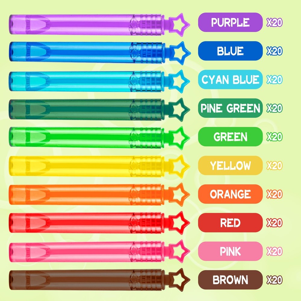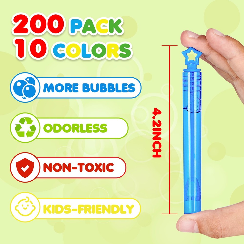 These mini bubble sticks are perfect for any celebration. With 10 colors to choose from, these make festive candy bag fillers or party favors for any themed children's event. Each bubble stick holds a generous amount of bubble solution so kids can blow bubbles for hours of fun. On birthdays, these mini bubble wands will be a hit, with kids taking turns making iridescent bubbles dance through the air. Packaged in a colorful rainbow assortment, these mini bubble makers are also great for weddings, carnivals or any outdoor summer gathering. At just a few cents each, you get 200 bubble sticks total, giving you plenty for a crowd while staying kind to your budget. Bubbles always bring smiles - get these mini bubble sticks and fill your next event with joy and wonder. COLORFUL ASSORTMENT: This set includes 200 mini bubble sticks across 10 vibrant colors including red, orange, yellow, green, blue, purple, pink, black, white and clear. FUN FOR ALL AGES: Whether for a birthday party, carnival prize or holiday gift, these compact bubble toys are sure to provide entertainment for kids and kids at heart ages 3 to 103. MESS-FREE FUN: Unlike traditional bubble solution, these mini bubble sticks require no mixing or blowing and won't create puddles, allowing fun both indoors and out. ENDLESS ENTERTAINMENT: Each bubble stick can produce up to 100 bubbles, so 200 sticks provides over 20,000 bubbles worth of popping pleasure and hours of mess-free amusement. COMPACT AND PORTABLE: Lightweight and taking up little space, these bubble sticks conveniently fit in favor bags, candy bowls, gift baskets or stockings, making them ideal party favors or holiday gifts.