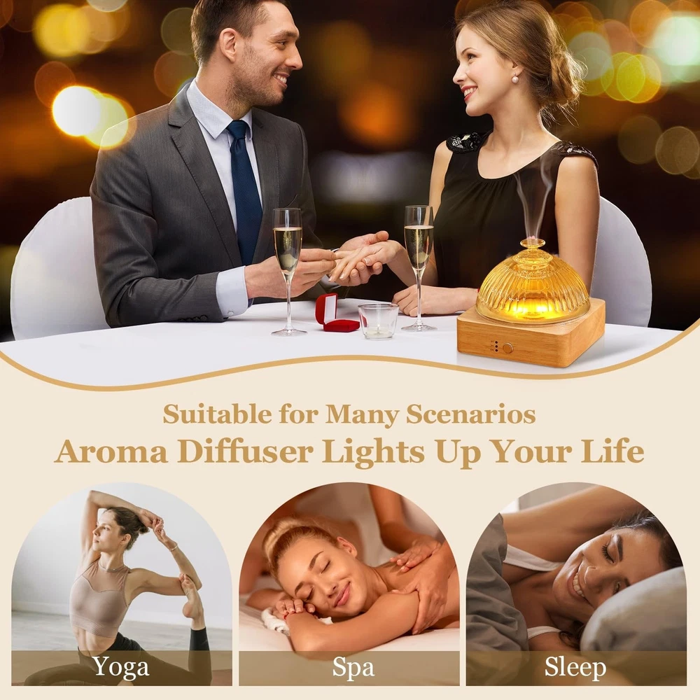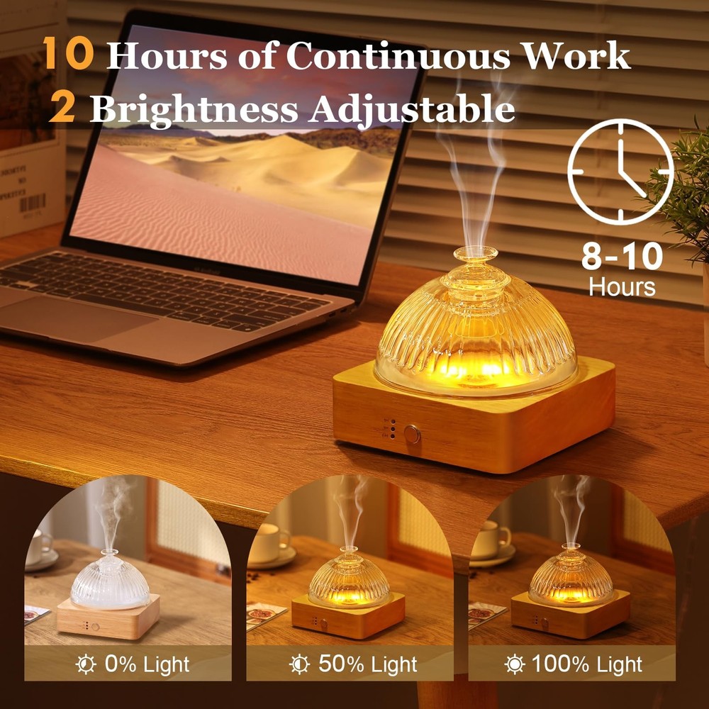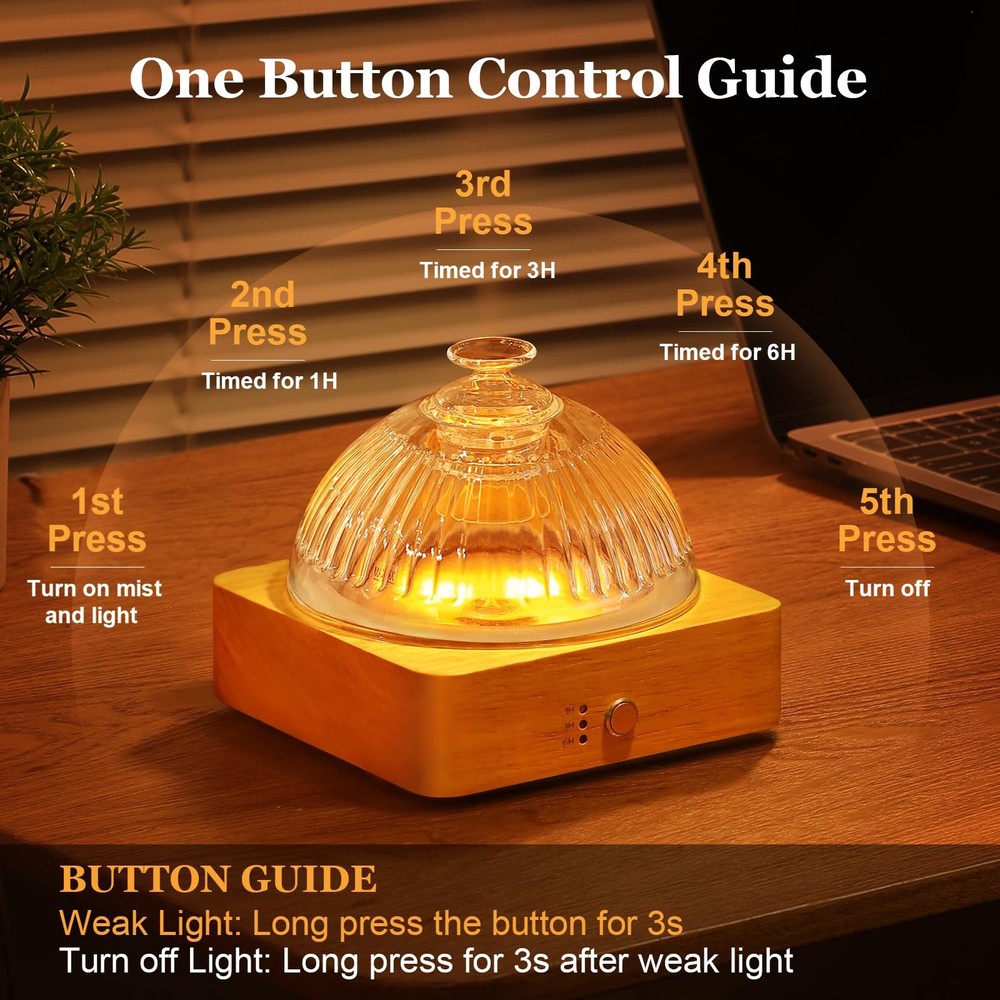 Please Note: 1.For use the product better, we have added Troubleshooting help in the manual. 2.Oil is not included in the package. 3.Use with natural essential oil. Do not use chemical essential oils which are corrosive. 4.Clean the diffuser after 3- 5times or 3-5 days of use. 5.Do not exceed the Max line 200ml when filling water (don't use the boiling water). 6. Don't open the diffuser cover when using. 7. Please add water below the max line (less water, more mist). ♨【No-Plastic Glass Reservoir】glass water tank aromatherapy diffuser is made of hand blown glass reservoir & cover and wood base by craftsmen with over 20 years of experience. Glass diffuser does not absorb essential oils to ensure the natural ingredient of essential oils remains optimal, has no unpleasant smell like other plastic aromatherapy diffusers, no smelly water tank and it brings you a healthy and comfortable aromatherapy experience. ♨【Brightness Dimmable】Our warm flame light air diffuser for bedroom can adjust Strong/Weak brightness. Weak Light: Long press the buttom for 5s. Turn Off Light: Long press 5s after weak light. ♨【Auto Shut Off】Our glass cool mist diffusers designed with waterless auto shut off function, to prevent overheating, to ensure the safety of use and extend the service life. The glass aromatherapy diffuser can run for 8-10 hours under the MAX line. ♨【Ultrasonic Glass Oil Diffuser】 Small glass air diffuser is advanced 3.5MHZ high frequency ultrasonic technology (<30dB) produces an ultra-fine and smooth mist, perfectly release the ingredients in the essential oils, with no residue of essential oils in the glass reservoir, making it easy to clean! ♨【Ideal Creative Practical Choice】 The glass humidifier diffuser has the functions of mist, timing, dimming. The versatile glass reservoir diffusers for bedroom can be used as humidifer, air aroma diffuser, warm night light, to create a comfortable atmosphere for you. This wood ultrasonic diffuser for essential oils is a awesome Choice for Birthday, Mother's Day, Father's Day, Christmas, Anniversary, Wedding Day, business. ♨【QUALITY SERVICE】As the diffusers glass is fragile, if there is any damage upon arrival, please contact us promptly for replacement, return, refund. We are committed to providing excellent customer service, If you have any questions, please log in to your Amazon account > choose "Your orders" > find the order ID > click "Contact seller, we will provide you with a contented solution!