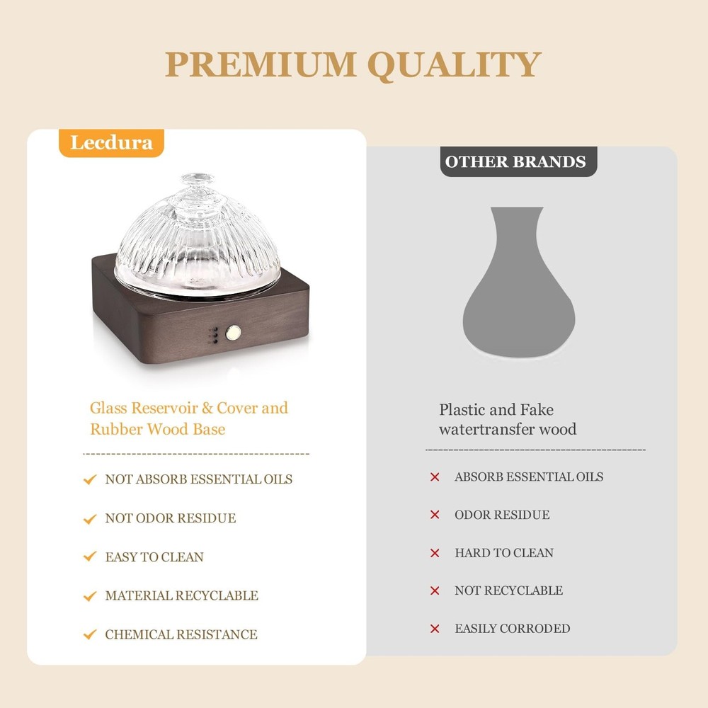 Please Note: 1.For use the product better, we have added Troubleshooting help in the manual. 2.Oil is not included in the package. 3.Use with natural essential oil. Do not use chemical essential oils which are corrosive. 4.Clean the diffuser after 3- 5times or 3-5 days of use. 5.Do not exceed the Max line 200ml when filling water (don't use the boiling water). 6. Don't open the diffuser cover when using. 7. Please add water below the max line (less water, more mist). ♨【Real Glass Reservoir Diffuser】This 200ml aromatherapy diffuser features a hand-blown glass reservoir and glass dome cover, crafted by artisans with over 20 years of experience, set on a wooden base. Unlike plastic reservoir diffusers that can absorb essential oils, this No-BPA glass reservoir diffuser allows the the natural ingredient of essential oils to remain optimal for a healthy diffusion. This glass diffuser is planet-friendlly and delivers a top-tier aromatherapy experience. ♨【Lock the Color by LONG PRESS 5S】This glass essential oil diffuser cycles through 7 soft colors - simply Long Press (5S) to lock your favorite light color that matches your mood. Turn Off the light: Long Press 5S to turn off the light After locked the light. The perfect pairing of cool mist and mood lights promotes relaxation. Add 1-3 drops of essential oils and water for 8-10 hours of aromatic bliss. Let the aromatherapy permeate any space - small or large room. ♨【Easy to Use & Auto Shut Off】This air aroma glass diffuser for home is designed for ease of use with one-button control of the soothing mist and colorful mood lights. It will automatically shut off when the water runs out to prevent overheating and ensure safe. Simply long press (5S) to lock in your favorite light color. You can also long press 5S to turn off the light After locked the lights if you don't want any disturbance. ♨【Ultra Quiet & 4 Timer Setting】This small diffuser utilizes advanced 3.5MHz ultrasonic technology to produce an ultra-fine mist while keeping noise under 30dB - perfect for sleep or relaxation. Choose from 1, 3, and 6-hours, or continuous on. Enjoy aromatherapy's benefits anywhere - home, bedroom, office, yoga, pilates, coffee shop, studio, nursery, or spa. The possibilities are endless with our quiet, versatile diffuser. ♨【Ideal Creative & Practical Choice】Room glass diffuser adopts ultrasonic technology to release cool mist. 3-in-1 glass aromatherapy diffuser serves as a humidifier, air aroma machine and night light all in one, and is ideal for relaxation, yoga, sleep, or self-meditation. The small aroma diffuser is a great Choice for housewarming, birthday, family, friends, wife, mom, lover, Christmas Day, Anniversary, Valentines Day, Thanksgiving Day, Wedding day. ♨♨【QUALITY SERVICE】As the diffusers glass is fragile, if there is any damage upon arrival, please contact us promptly for replacement, return, refund. We are committed to providing excellent customer service, If you have any questions, please log in to your Amazon account > choose "Your orders" > find the order ID > click "Contact seller, we will provide you with a contented solution!