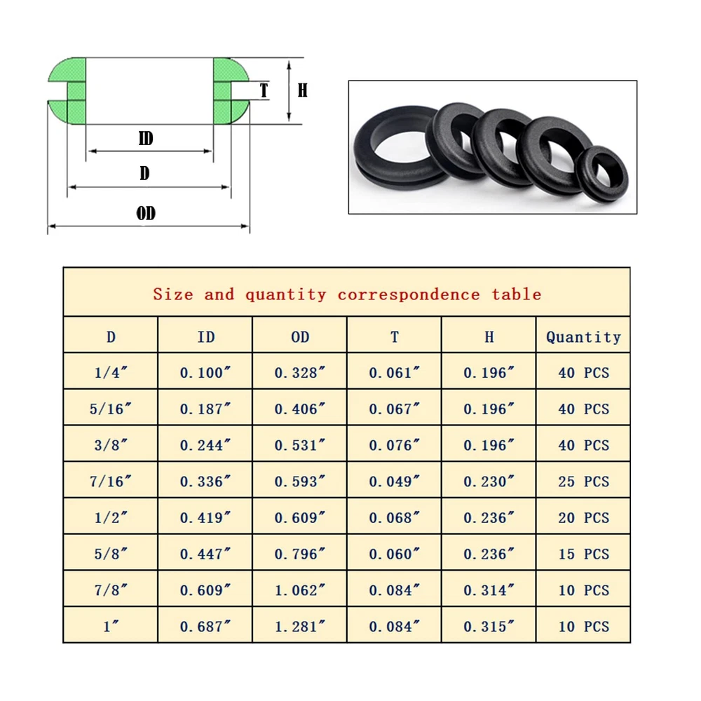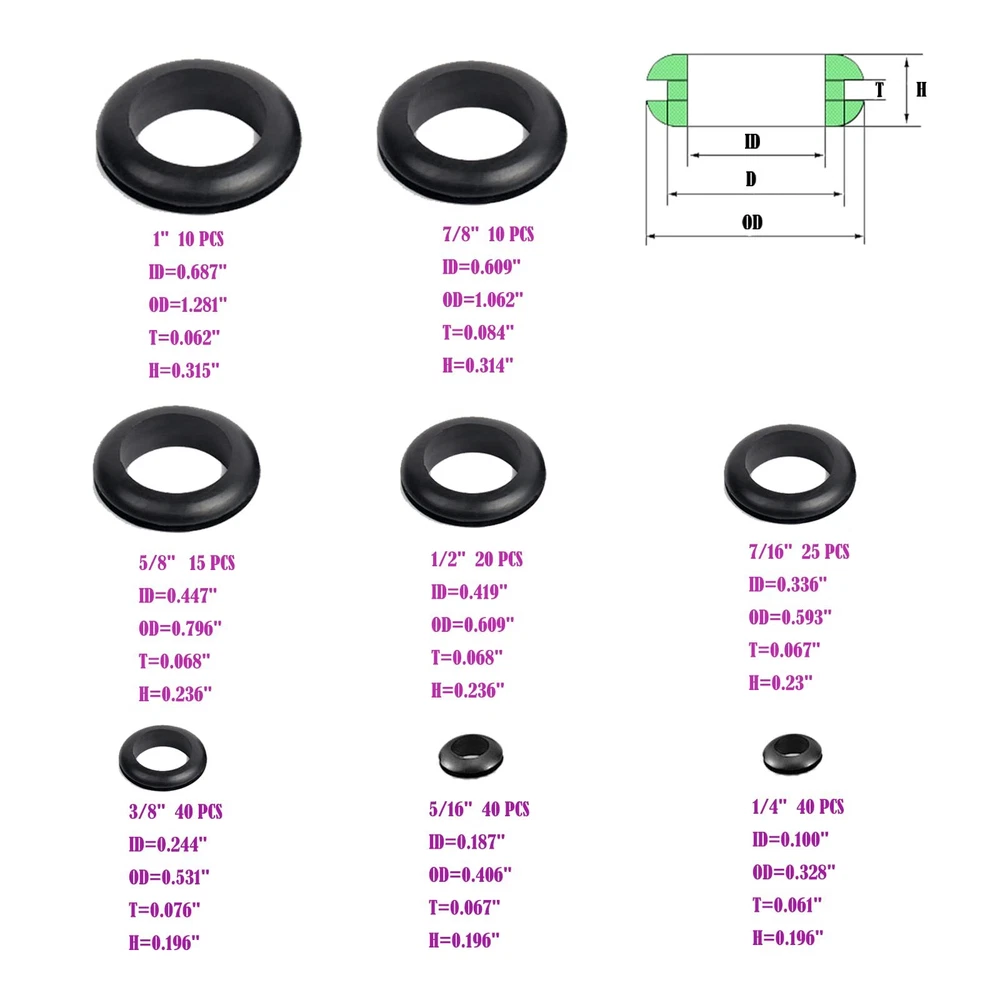 YUFANNET 200Pcs Rubber Grommet Assortment Kit, 8 Sizes Rubber Grommets for Wiring Automotive,Plumbing, Hardware Repair Firewall Hole Plug Electrical Wire Gasket Set Rubber seal rings set include:200 pieces of different sizes rubber grommets, 1"(10 pcs) , 7/ 8"(10 pcs), 5/ 8"(15 pcs),1/ 2" (20 pcs), 7/ 16 " (25 pcs), 1/ 4", 5/ 16", 3/ 8"(40 of each). Made of flexible rubber material, they are of good electric resistance capability. Corrosion resistance, high temperature resistance and tear-resistant. Wide application,rubber o rings are for wiring repair, and can prevent metal-on-metal contact thus to protect wiring, Fit for automotive, cylinder, valve, pump, electrical appliance, chemical pipe, spray, water pipe, plumbing, hardware and piano repair. Easy to use,o rings are designed for easy installation and click snap affixing drill holes, metal panels would create a neat finished look on furniture and electric boxes Handy packing,clear plastic case makes it easy to find correct item quickly, saves your time of running around looking for a particular size grommet.any question please tell us,We will help you resolve your concern. Rubber seal rings set: include 200 pieces of different sizes rubber grommets rubber grommets sizes: 7/ 8, 1 inch(10 of each) 5/ 8 inch(15 pieces) 1/ 2 inch (20 pieces) 7/ 16 inch (25 pieces) 1/ 4, 5/ 16, 3/ 8 inch (40 of each) * Order Cancellation Policy ** You can return a product for up to 30 days from the date you purchased it. 1. The seller reserves the right to cancel the special case only due to eBay cancellation fee. 2. The decision of seller is the final. 3. The seller will respond to the cancellation request within 2 business days. Please wait for the result of cancellation. 4. In case the cancellation is not completed by some reasons, the buyer can follow the options below to get the refund. 4.1 The buyer can reject the item when it arrives. 4.2 The buyer can send the item back to the seller within 30 days If the buyer receives item (USA Shipment ONLY). The seller will provide the FREE return label to the buyer when the buyer opens " Return Item" case on eBay by using the reason as "Change my mind" ONLY. 5. When buyer has placed the order. The order will be processed and completed by automatic warehouse system within 5 minutes. In case that buyer sends the cancellation request after 5 minutes of placing the order, the request will be rejected. **Sending direct message to cancel the order is not allowed for every case.* Return Policy For the return case - If buyer would like to return the items for refund or replacement, please CONTACT SELLER to receive the free return label from seller. The refund or replacement will be processed with the tracking number of return label which is provided by seller only. The other ways of return which are not approved by seller will not be processed for the refund or replacement. SHIPPING Domestic Buyers - We ship within 3 business days of payment, usually sooner - We offer FREE shipping on all orders! - We only ship to the lower 48 states, no APO/FPO addresses or PO Boxes allowed - We have confidence in our products, but if you are not fully satisfied please contact us within 30 days of purchase and you will get full refund. International buyers – please note: Import duties, taxes, and charges aren't included in the item price or postage cost. These charges are the buyer's responsibility. - Please check with your country's customs office to determine what these additional costs will be prior to bidding or buying.
