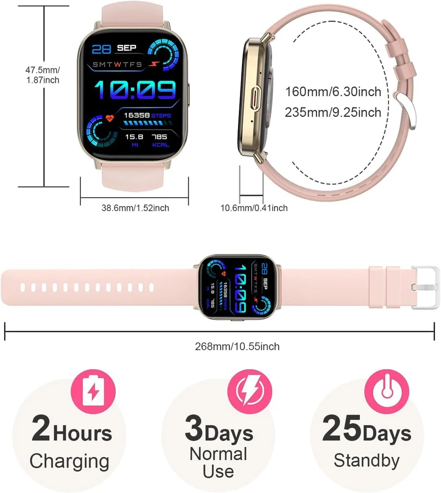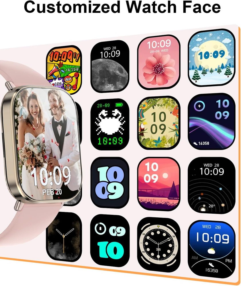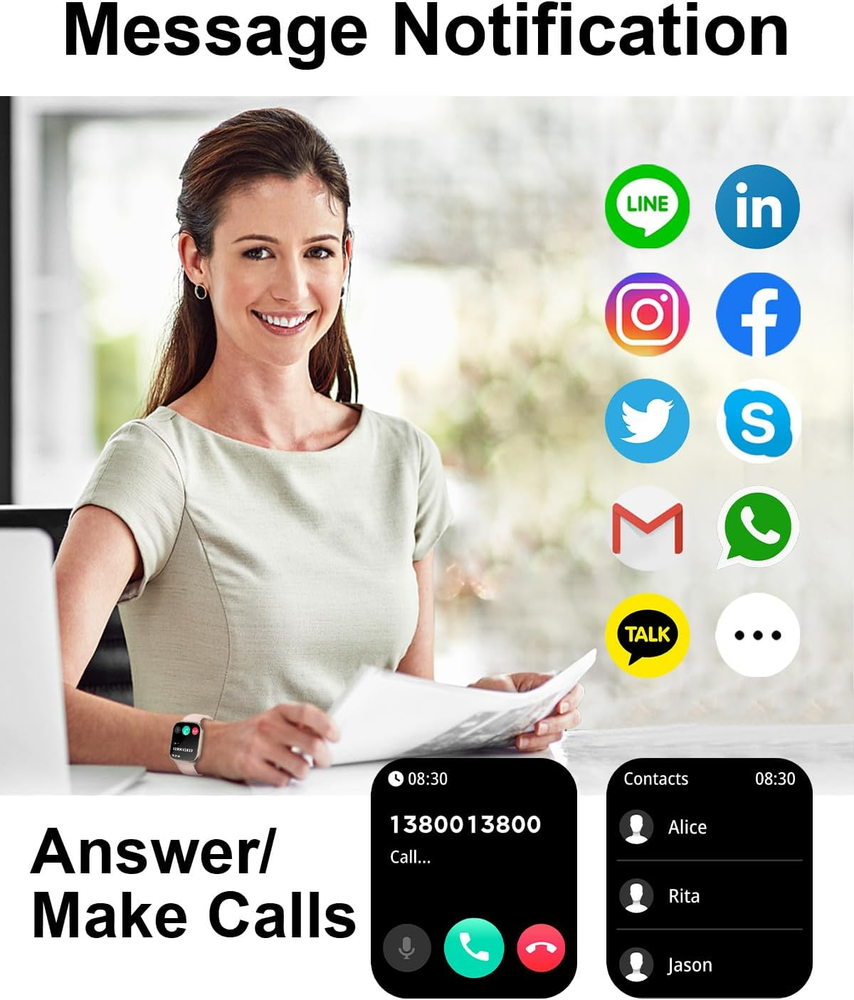 【2.01” HD Screen & 100 Watch Faces】The fitness tracker watch is equipped with a large 2.01-inch HD colorful screen, delivering exceptional picture quality and highly responsive touch sensitivity. Express yourself with an collection of over 100 watch faces, or you can also personalize the watch face by selecting your favorite photo. 【Al Voice Control & Bluetooth Calling】Work with Al Voice assistant, you can ask questions, control music playback, check the weather, set alarms and timers, and more by speaking to your watch. With Bluetooth 5.2, you can also answer/make clear calls directly from your smart watches when your phone is out of reach. (THE WATCH CAN NOT SEND MESSAGES, or TEXT BACK, Bluetooth distance 8-10 meters). 【24/7 Accurate Health Monitoring】This fitness watch will continously records your daily steps, distance, calorie consumption. Also it features advanced sensors to monitor heart rate, blood oxygen levels, stress levels & sleep tracking. All recorded data can be synced to your phone for analysis, providing valuable insights into your health and facilitating lifestyle adjustments. 【120+ Sports Modes & IP67 Waterproof】The Fitoncloud sports watch supports over 120 sports modes, including Running, Walking, Hiking, Badminton, Boating, Climbing, Cycling, Fitness, Swimming, Yoga & More. This smart watch allows you to accurately track your exercise time and calories burned, aiding in maintaining a healthy balance between activity and rest. It boasts an IP67 waterproof rating, ensuring worry-free use even while washing hands, face, or engaging in sweaty activities 【Message Notification & Powerful】Stay connected to SMS and app messages from Text, Facebook, WhatsApp, Instagram, X, Telegram, Tiktok, Skype and more. Our fitness watch also contains many useful tools, such as Bluetooth answer/make call, Medication reminders, Cycle Tracking, Weather forecast, Music control, Camera control, Setting alarms, Stopwatch, Timer, Breather guide, Raise to wake, Find phone and so on. 【Widely Compatible & Long-Battery Life】Work seemlessly with iOS or Android smartphones (Compatible with iOS 9.0 or above, Android 5.0 or above). Including but not limited to iPhone 6~iPhone 15, Samsung, Google pixel Nexus, Microsoft, Huawei, Xiaomi HTC and More. With 2 hours of full charging time, it can last 3 days with typical use or 25 days’ standby 【Unlimited Experience】If you encounter any issues, please feel free to contact our customer service representatives through Amazon. We are here to assist you year-round. Product Description A Sporty ,Versatile and Comfortable Smartwatch for Men and Women A great gift! A sporty, Beautiful smart watch with great features. It's a great gift for families, friends. You can listen to music, call and receive calls. You can get text alerts and alerts from all my email and social media accounts. Health Monitoring: Tracks your sleep, heart rate, blood pressure and more. Facilitates your daily life, they have become a part of you! It tracks multiple sports modes accurately, including running, cycling, and yoga, while also monitoring heart rate, steps, and calories all day.