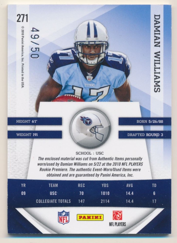 2010 Gridiron Gear Rookie Gridiron Gems Jerseys Prime #271 Damian Williams/50 Front Back Sport: Football Set: 2010 Panini Gridiron Gear Rookie Gridiron Gems Jerseys Prime Year: 2010 Item#: 271 Player: Damian Williams Team: Tennessee Titans Attributes: Memorabilia, Serial Numbered Brand: Panini Gridiron Gear Manufacturer: Panini Group Grading Company: Raw Grade SetType: Insert Item Condition: Near Mint/Mint 2014 Beckett Collectibles, LLC. All Rights Reserved Powered by: Thank you for choosing Burbank Sportscards, the sports cards superstore. We offer a large selection of singles across all sports. Visit our ebay store to view all our items available. Our Shipping Policy We offer Free Standard Shipping to all Domestic customers. Options for Expedited shipping are also available at checkout. For our international customers, shipping is $9.99 for the first item, and $0.25 for each additional item. Note to all customers: To qualify for combines shipping, we ask our customers to add items into the shopping cart. Please note, we do not combine orders that are placed separately. Our Service: Generally, our turnaround is super quick as we process and send out orders same day payment is received. Stock Availability: We do our best to ensure all items are in stock; however, in case of the rare stock out, the customer will have the option for a replacement card, or we will process a refund so the order is not held up. Our Images: Many of our images are stock photos from Beckett archives. They are a representation of the actual card you would receive. If you have any questions regarding the item you're interested in, please feel free to ask (serial numbers and relic pieces may vary) Moreover, in a case of a wrong or defective photo, please notify us, so we can adjust it. Other FAQ's: -When buying multiple cards, do you top load each item? No; however, we do try to insure all items are shipped securely. If you wish to have all of your cards top loaded it is a paid service and can be arranged. Please email for more details. For other questions, please feel free to ask. Thank you.