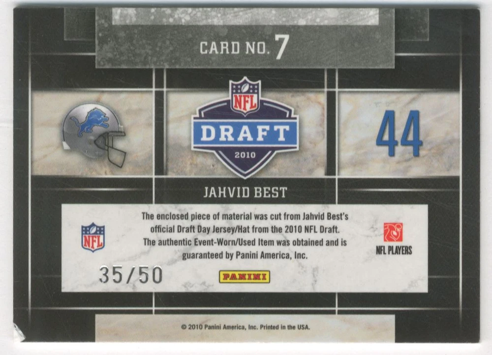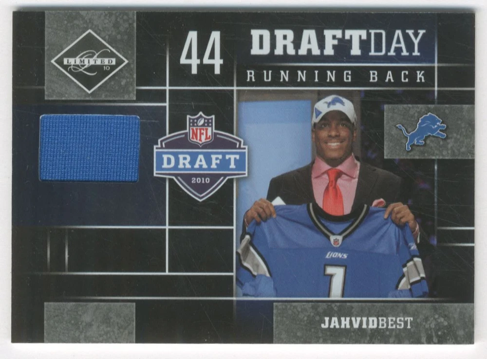 2010 Limited Draft Day Jerseys Prime #7 Jahvid Best /50 Front Back Sport: Football Set: 2010 Limited Draft Day Jerseys Prime Year: 2010 Item#: 7 Player: Jahvid Best Team: Detroit Lions Attributes: Memorabilia, Serial Numbered Brand: Limited Manufacturer: Panini Group Grading Company: Raw Grade SetType: Parallel Insert Item Condition: Near Mint/Mint 2014 Beckett Collectibles, LLC. All Rights Reserved Powered by: Thank you for choosing Burbank Sportscards, the sports cards superstore. We offer a large selection of singles across all sports. Visit our ebay store to view all our items available. Our Shipping Policy We offer Free Standard Shipping to all Domestic customers. Options for Expedited shipping are also available at checkout. For our international customers, shipping is $9.99 for the first item, and $0.25 for each additional item. Note to all customers: To qualify for combines shipping, we ask our customers to add items into the shopping cart. Please note, we do not combine orders that are placed separately. Our Service: Generally, our turnaround is super quick as we process and send out orders same day payment is received. Stock Availability: We do our best to ensure all items are in stock; however, in case of the rare stock out, the customer will have the option for a replacement card, or we will process a refund so the order is not held up. Our Images: Many of our images are stock photos from Beckett archives. They are a representation of the actual card you would receive. If you have any questions regarding the item you're interested in, please feel free to ask (serial numbers and relic pieces may vary) Moreover, in a case of a wrong or defective photo, please notify us, so we can adjust it. Other FAQ's: -When buying multiple cards, do you top load each item? No; however, we do try to insure all items are shipped securely. If you wish to have all of your cards top loaded it is a paid service and can be arranged. Please email for more details. For other questions, please feel free to ask. Thank you.