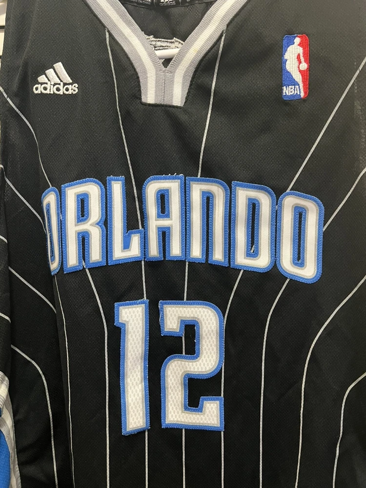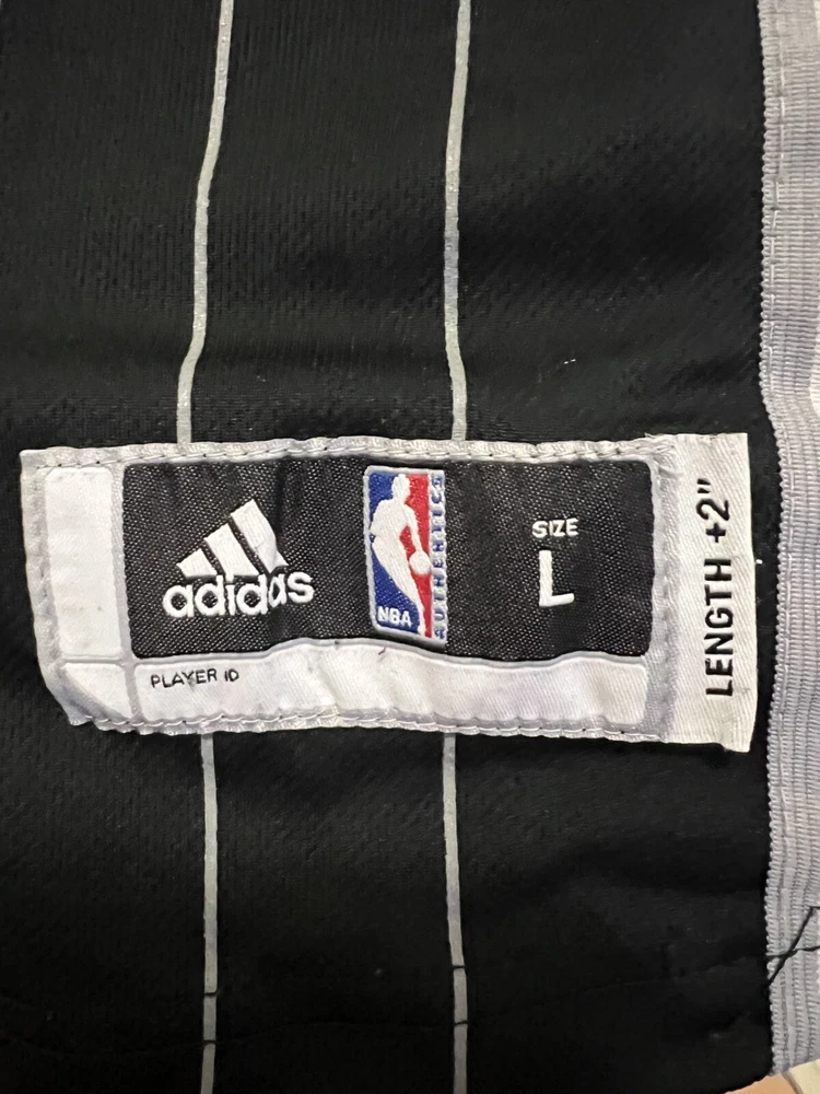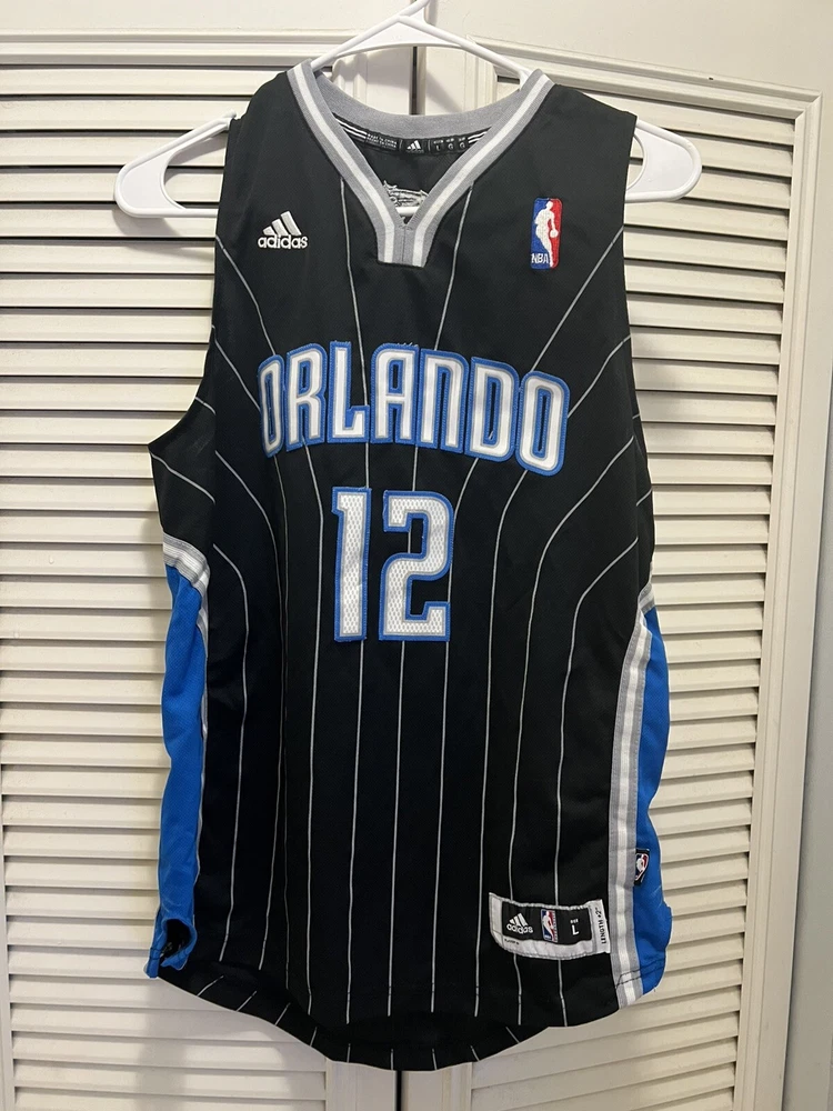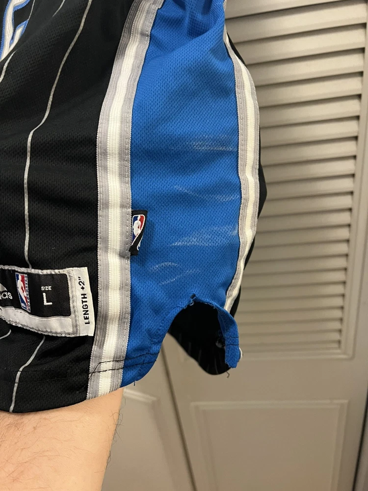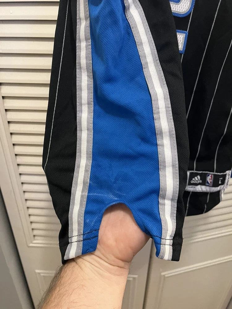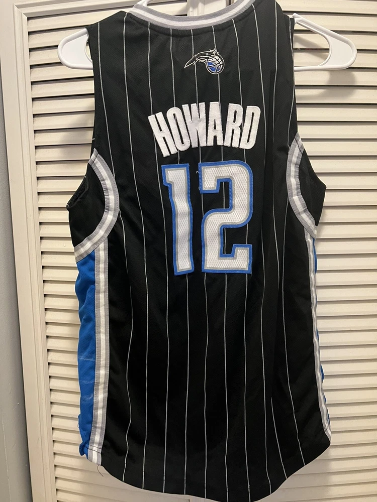 The product is a 2010 Orlando Magic Dwight Howard Adidas Al Pinstripe Swingman Jersey in youth size large. This officially licensed NBA jersey features the player's name, team, and the Adidas brand logo. The jersey is designed in a black color with pinstripes, suitable for men. It is specifically for the regular season of the National Basketball Association (NBA) and is perfect for fans looking to represent the Orlando Magic and Dwight Howard on the basketball court or in everyday wear. Please examine all pictures for condition. Some white marks on the sides. Could possible be washed off.