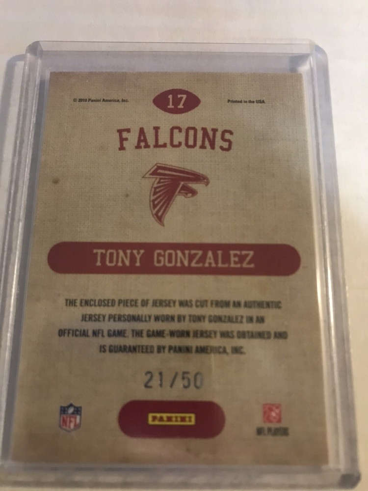 You are bidding on a 2010 Panini Threads Tony Gonzalez 2 color Prime jersey patch card #d 21/50.. The card will be shipped in a soft sleeve, top loader and mailed in a cardboard filled padded mailer..