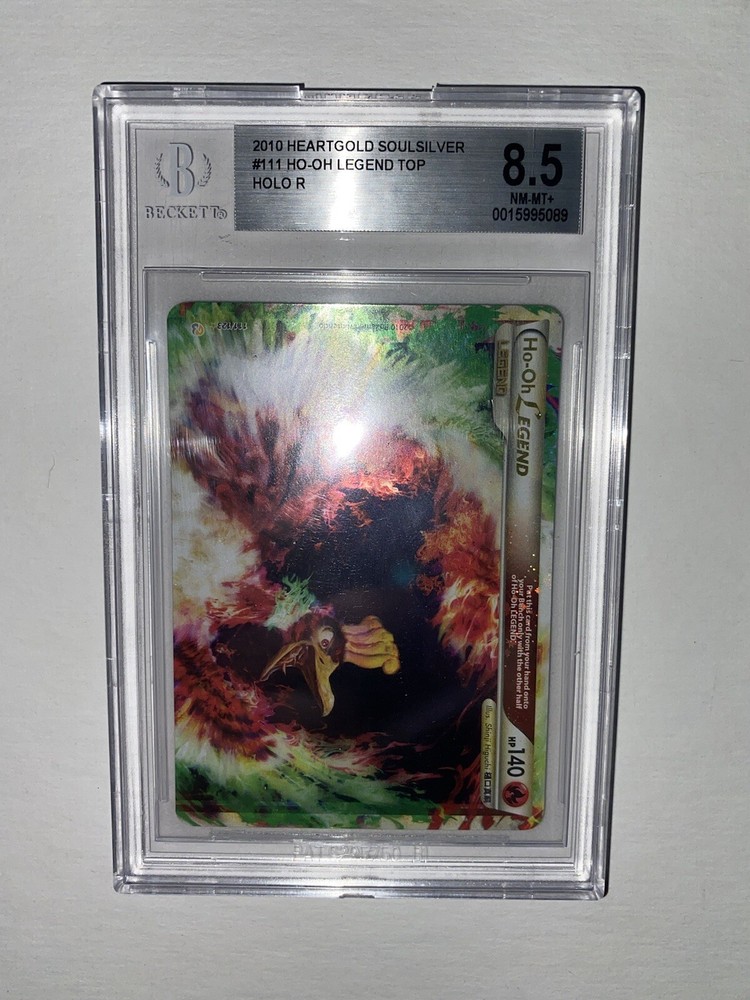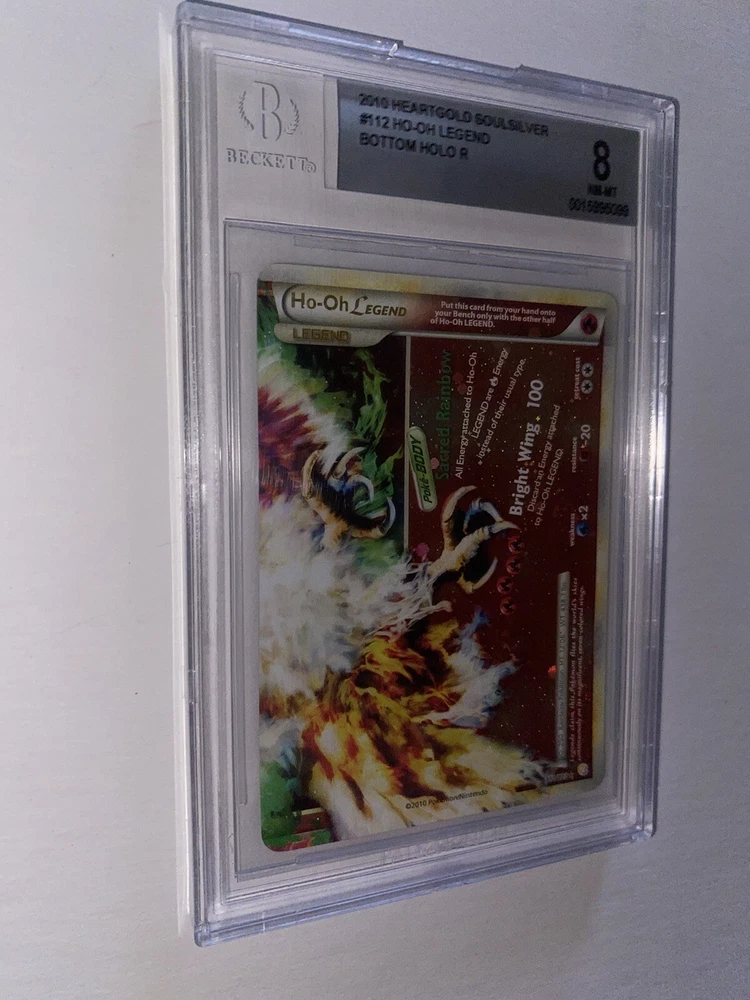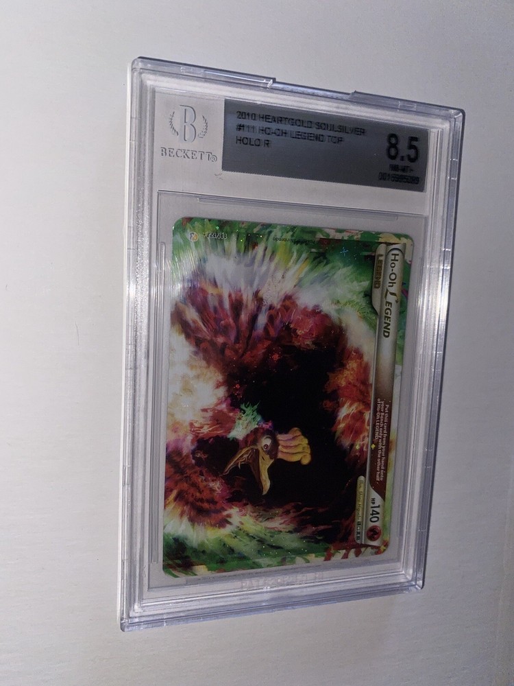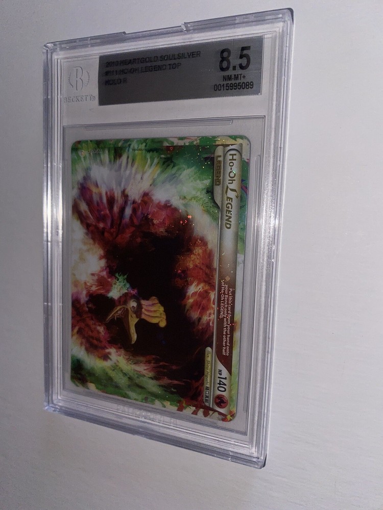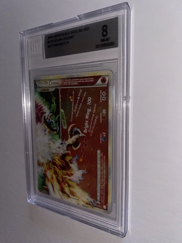 The 2010 Pokémon HG & SS Ho-Oh Legend card is a rare and highly sought-after collectible in the Pokémon TCG. This ultra-rare card features Ho-Oh the rainbow legendary bird, part of the Legends set. Graded 8.5 and 8 by Beckett Grading Services, this full art, split card showcases unique artwork by Shinji Higuchi and is a part of the Base set HeartGold and SoulSilver. With a standard size and holo finish, this English-language card is a special addition to any collector's deck. HGSS base set Ho-Oh Legend grades in BGS 8.5 and 8. Message me with any questions. Happy Hunting.