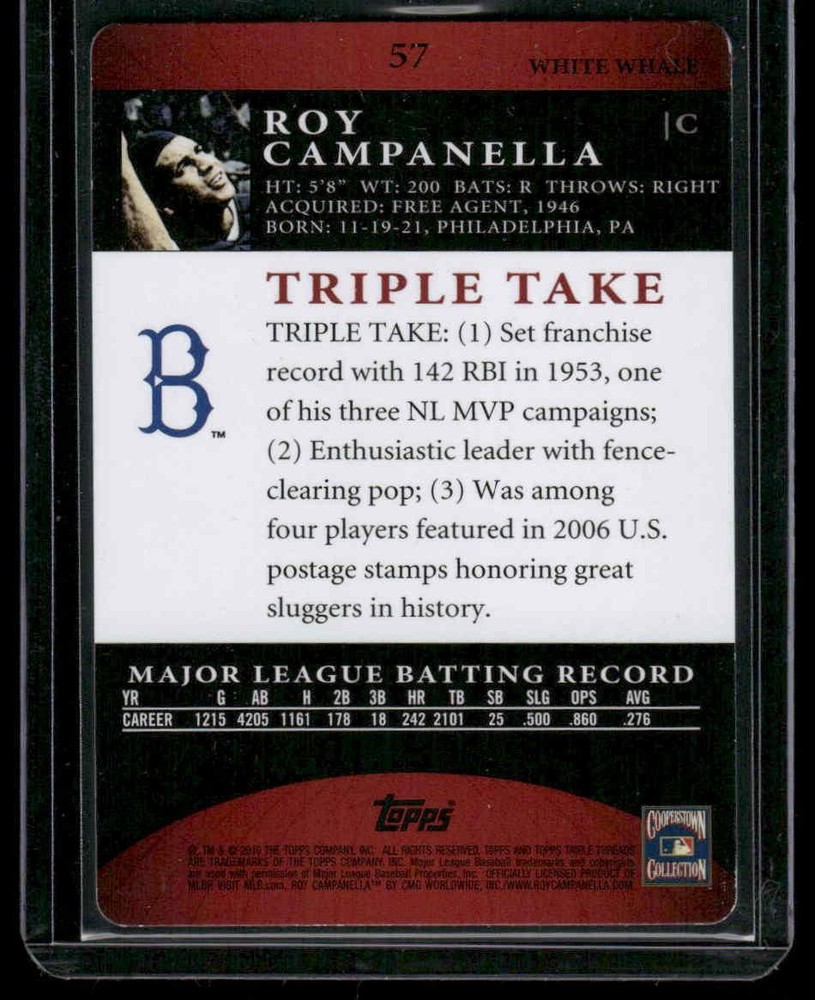 Season: 2010 Insert Set: Printing Plates Yellow Player/Athlete: Roy Campanella Team: Brooklyn Dodgers Graded: No Features: SN Sport: BASEBALL League: MLB Parallel/Variety: Printing Plates Yellow Autographed: No Set: 2010 Topps Triple Threads Card Number: 57 Type: Sports Trading Card Manufacturer: Topps Year Manufactured: 2010